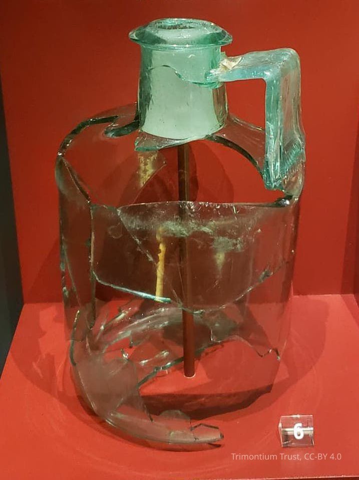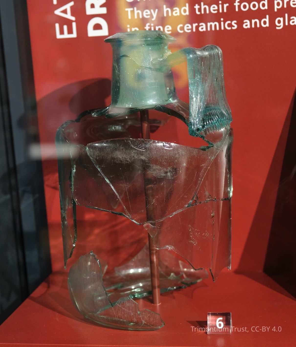 Glass jar in two parts from the Roman site at Newstead. In many parts broken but reconstructed with fragments into two parts.