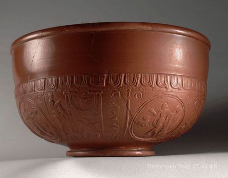 Part of the base of a large bowl of Samian ware, with circular and upright panels with animals and figures, from the Roman site at Newstead (Trimontium)Use
