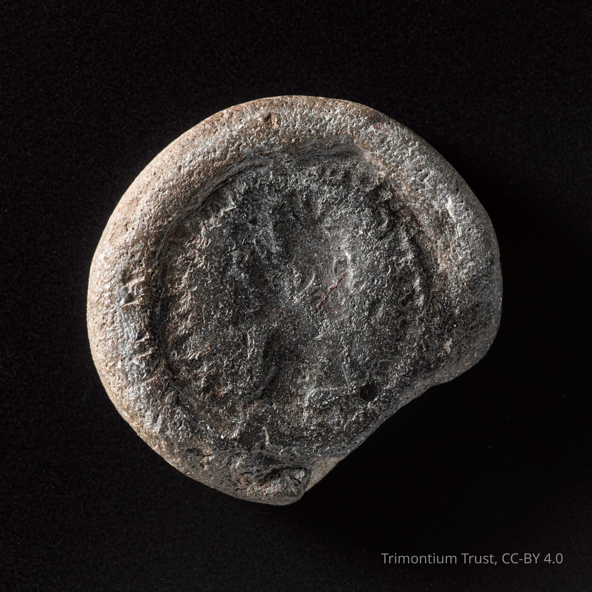 Mould for making counterfeit coins (denarii); Newstead (Trimontium), Scottish Borders. Ceramic mould from the end of a stack of such moulds used for making counterfeit coins. One face has the impression of a denarius of Antoninus Pius. Broken on one edge from removal of the coin. Found at Newstead (Trimontium) and brought to the National Museum of Scotland by the late John Casey of Durham University many years ago.Use