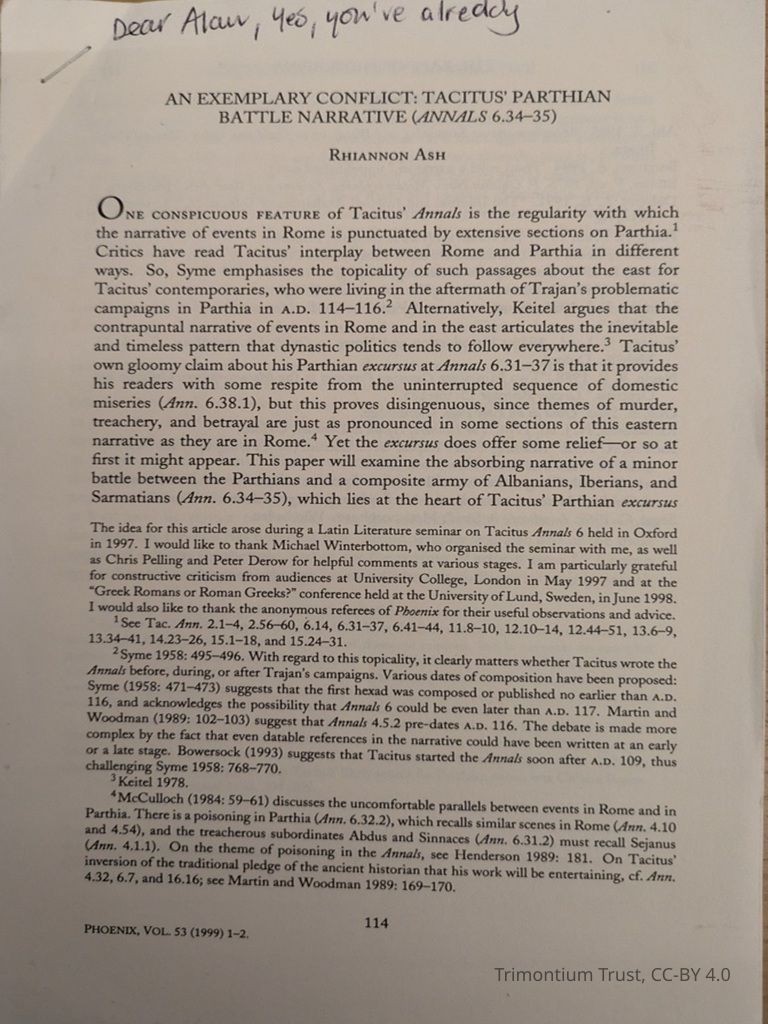 This is an extract from the Journal of the Classical Association of Canada "Pheonix", Volume 53 (1999) 1-2. Why does a minor battle between the Parthians and a mixed Albanian, Iberian, and Sarmatian army receive such attention from Tacitus (Annals 6.34-35)? This article examines how Tacitus embellishes the battle, not only in order to enhance its aesthetic appeal, but also to signpost it as a compelling historical exemplum for contemporaries.Lexicon