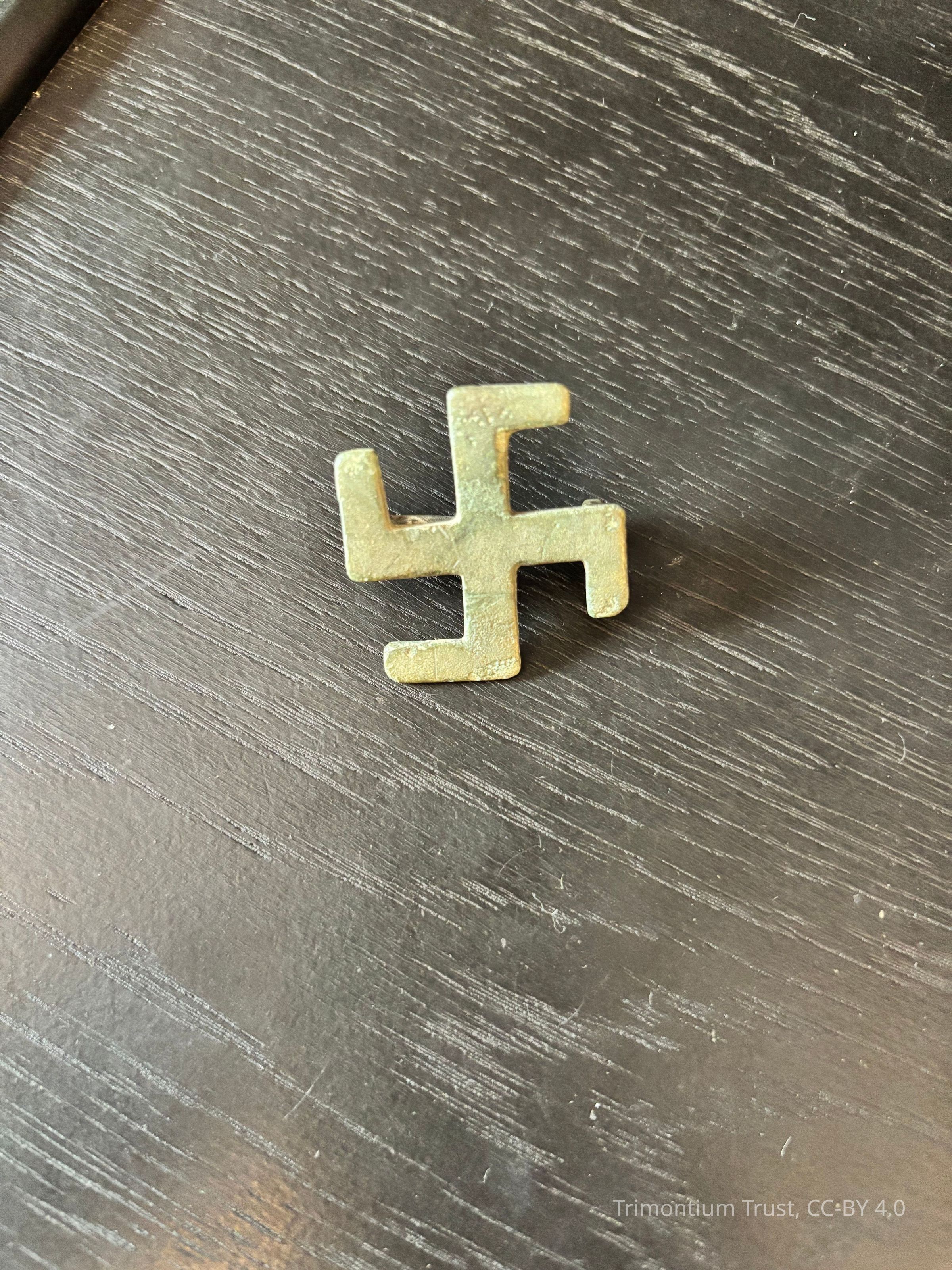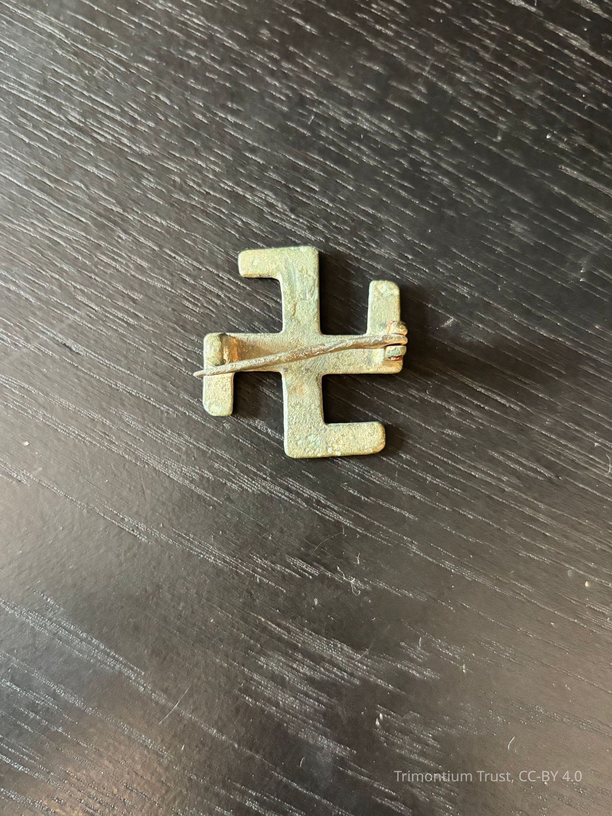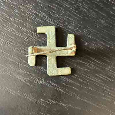 Brooch made in swastika design, with closure mechanism intact. Coloured green from corrosion.