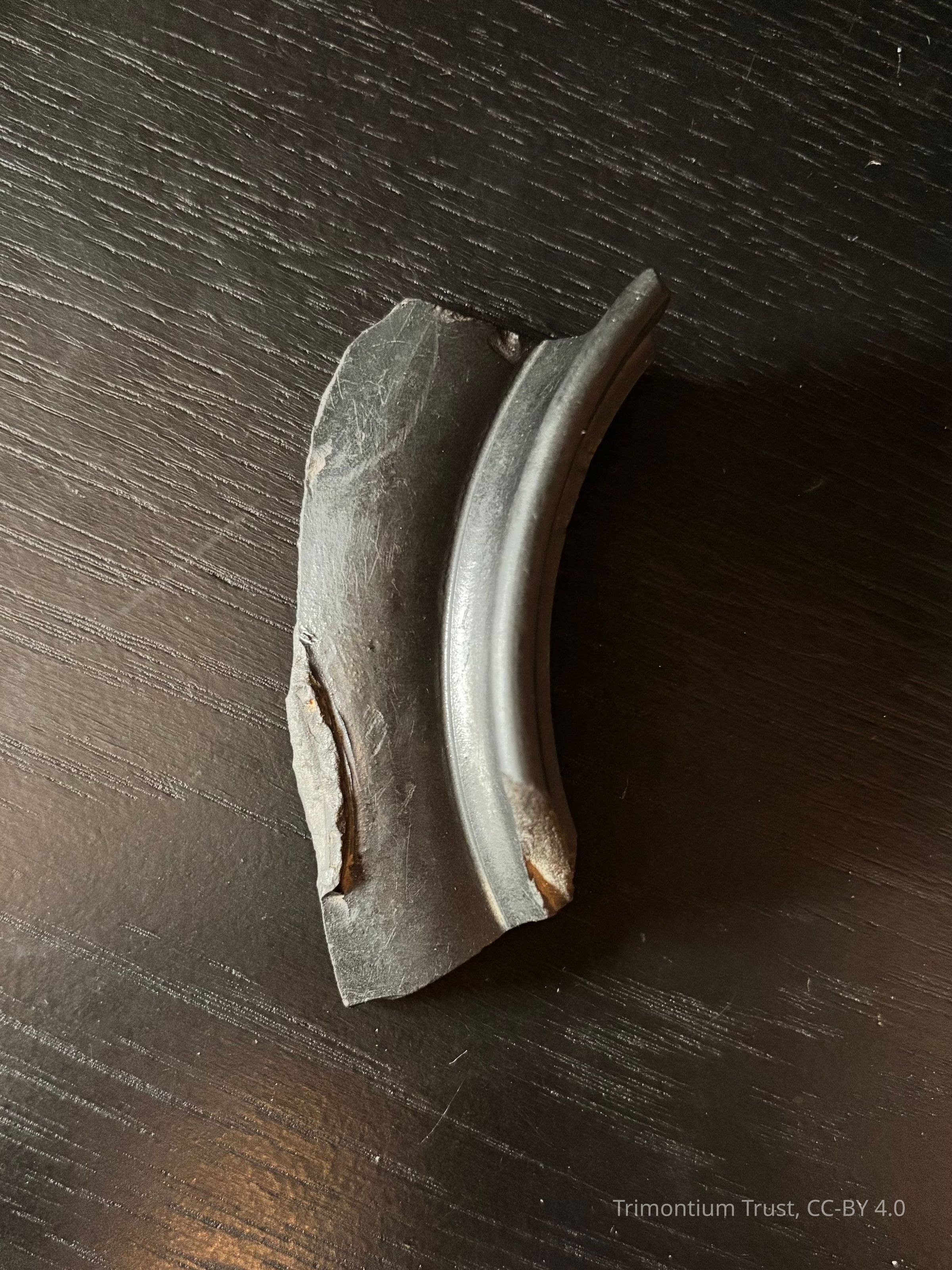 Gray pottery fragment, probably from the rim of a jug.