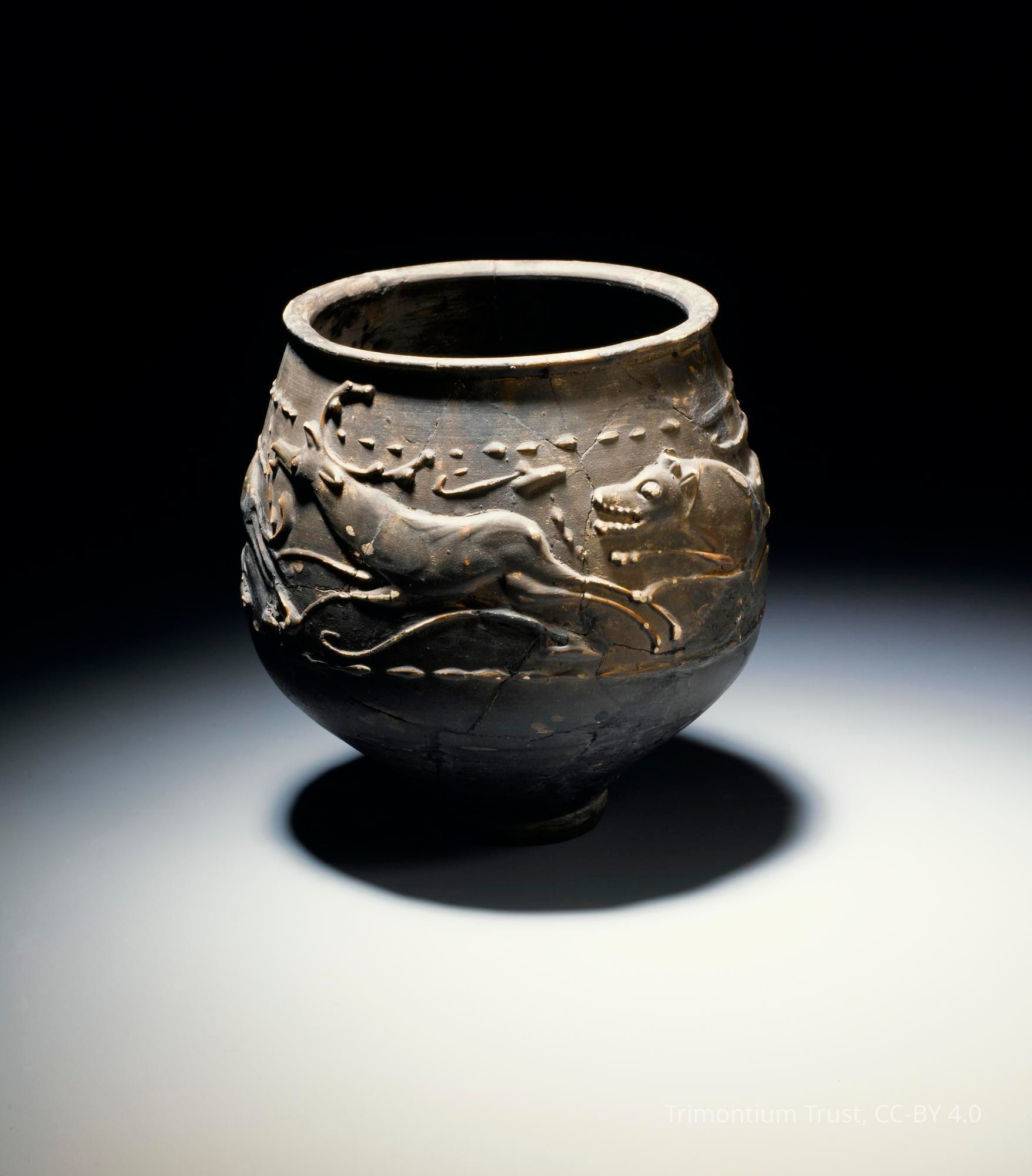 Castor ware beaker of thin white ware, covered with a black engolie. Decorated in barboutine with a chase scene showing a stag and a hind chased by hounds wearing collars, from the Roman site at Newstead (Trimontium), 140 - 180 ADUse