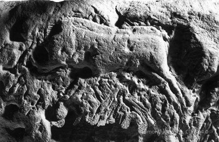 Detail of a column impost (capital) of red sandstone, roughly finished, with a relief carving of a boar. It has a lewis hole on the top; one end shows fine diamond dressin. From Trimontium, Roxburghshire, 80 - 180 ADUse