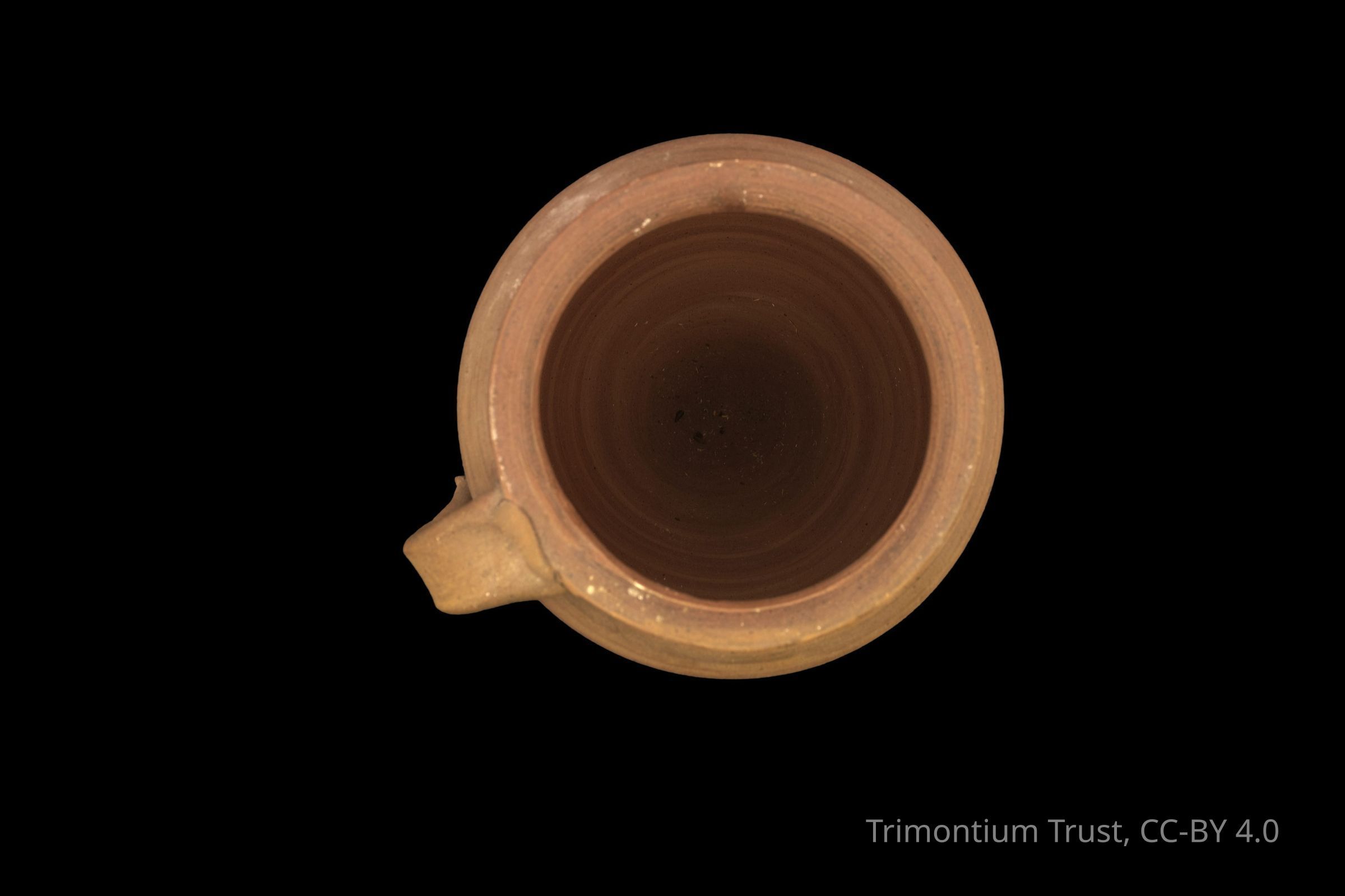 Replica pot with handle in red fabric with traces of white paint. Depression on one side with grain.