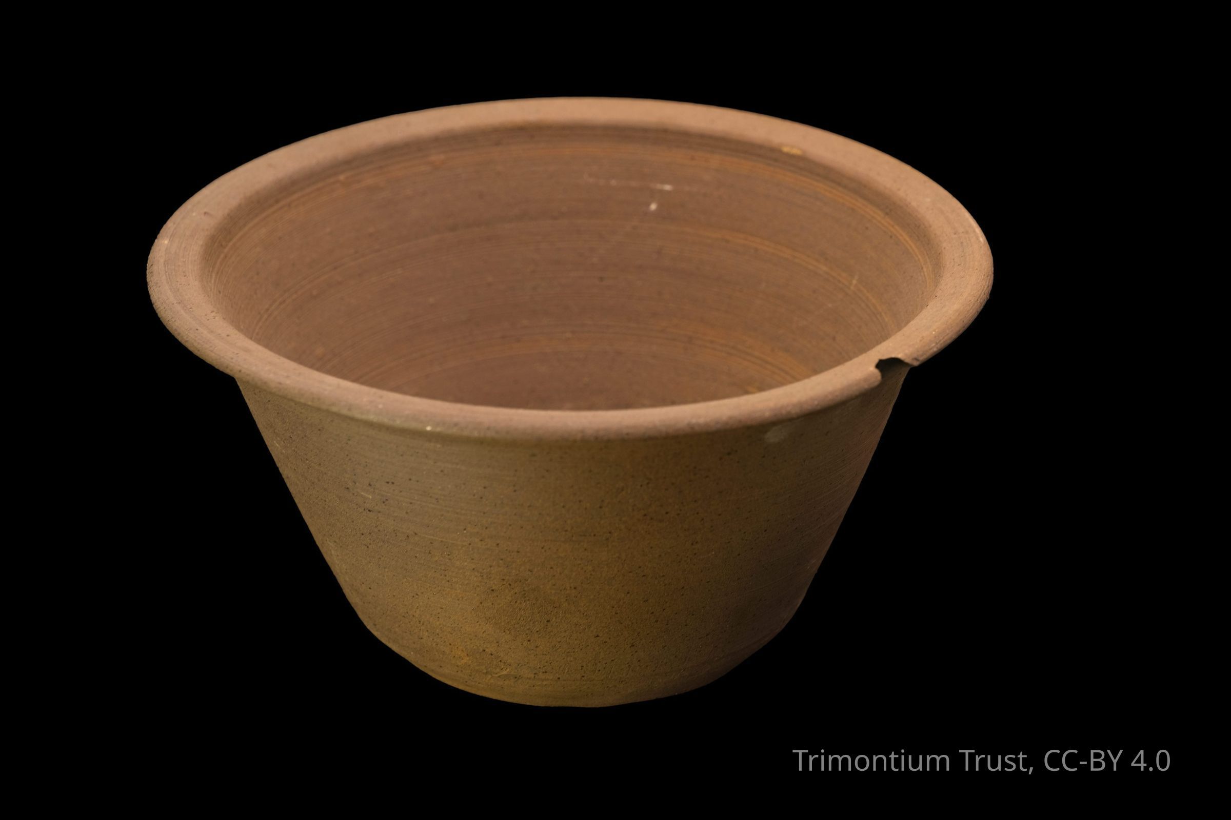 Replica pottery vessel with chip on rim, reddish brown fabric.