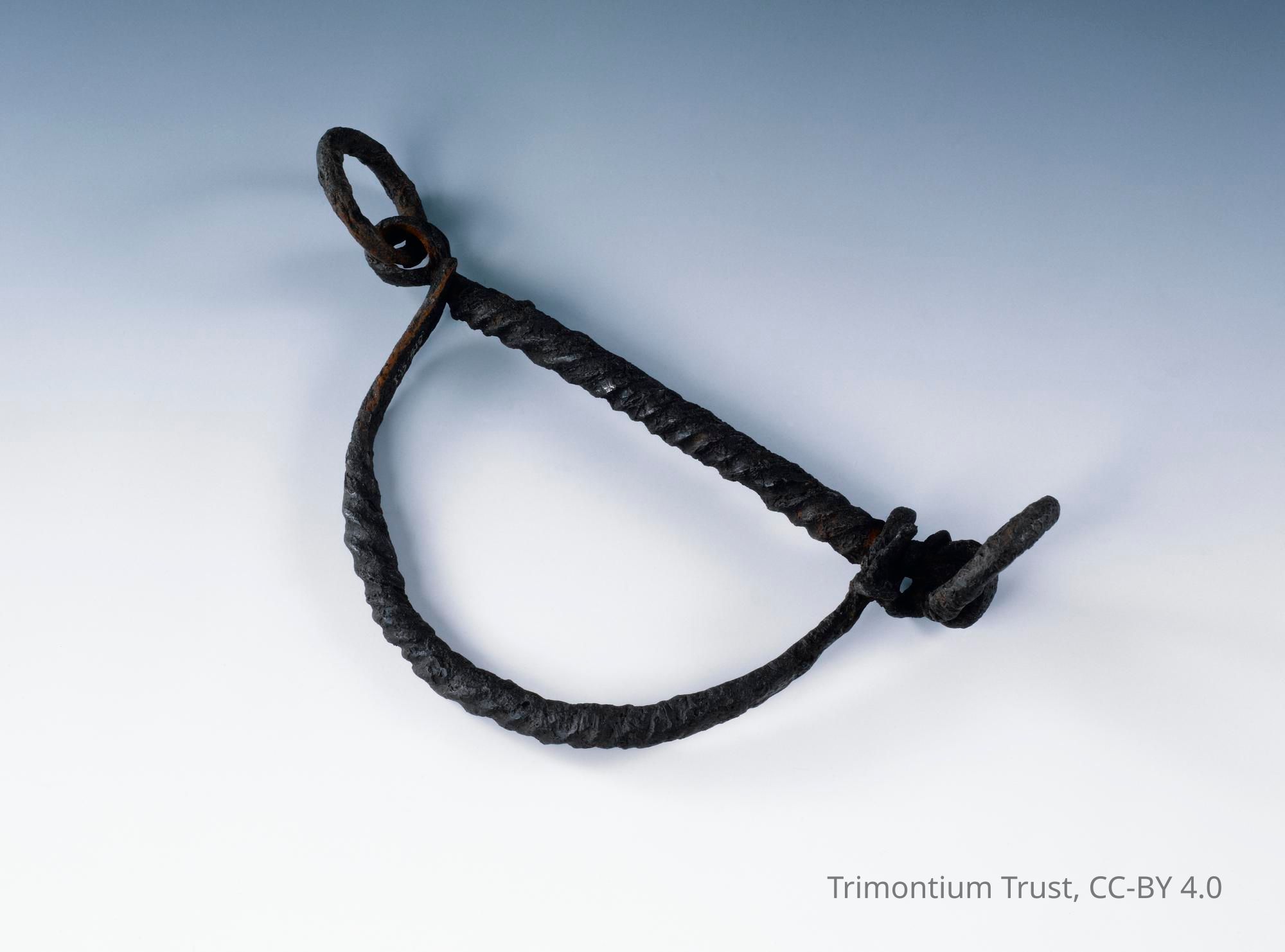 This was used to help steer the horse with the help of the harness. "The bridle bit is unusually well preserved. It is a type known as a snaffle bit. It fitted in a horse's mouth and reins were attached to the rings. The Romans used several types of horse bits. Some were used for riding, some for pulling carts and wagons, while some others could serve both purposes." - From NMS Scran