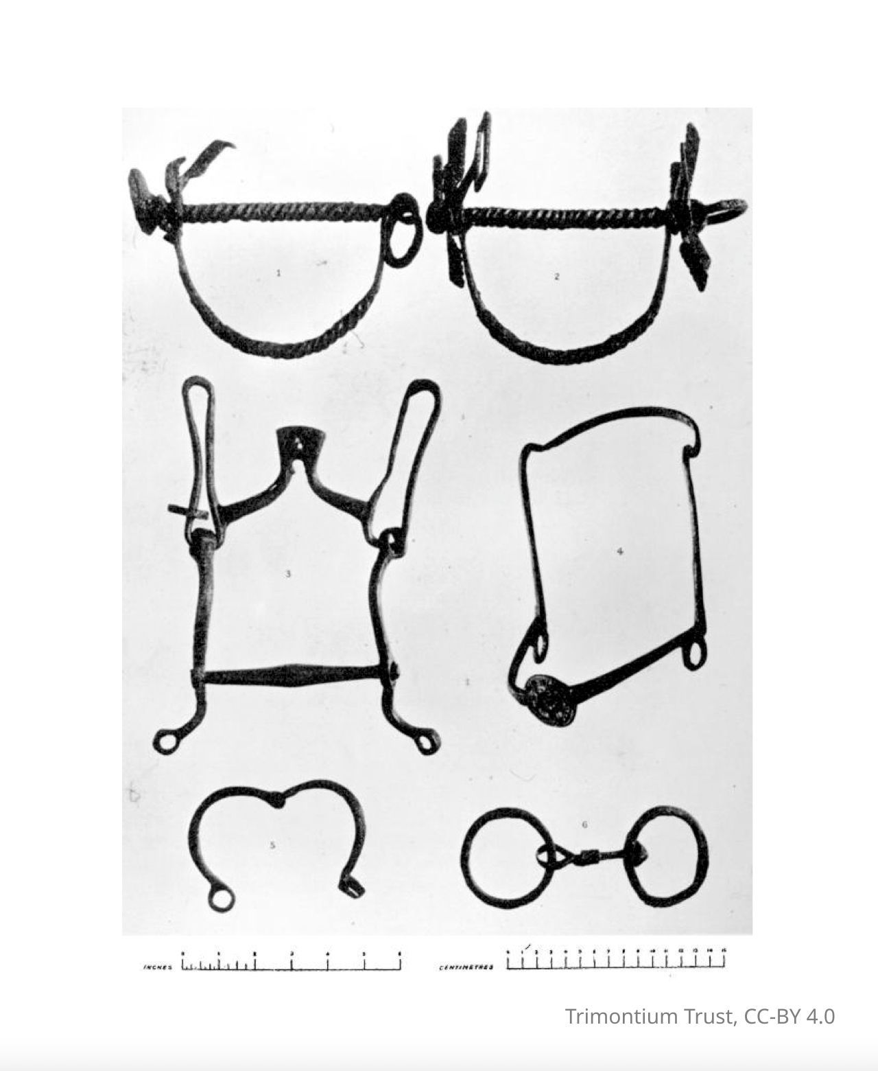 "A Roman Frontier Post and Its People", J. Curle, p. 296 "...The bar, which is 4 5⁄8 inches in length between the cheeks, is ridged by twisting. Joined to it at either end is a rigid curb bent almost to a semi-circle, and also twisted. Immediately beyond the points at which the curb is attached are two rectangular loops, each 1½ inches long, by which the bit must have been fastened to the head-stall. Beyond these, on either side, are rectangular plates, the corners of which have been hammered out, and the edges serrated, the whole somewhat in the shape of a St. Andrew's cross. Fastened to each end of the bar are the rings for attaching it to the reins. These bits probably date from the end of the first century. A Gallo-Roman specimen, somewhat similar in construction, showing a rigid curb and the same square loops for attachment to the head-stall, was found at Alesia."