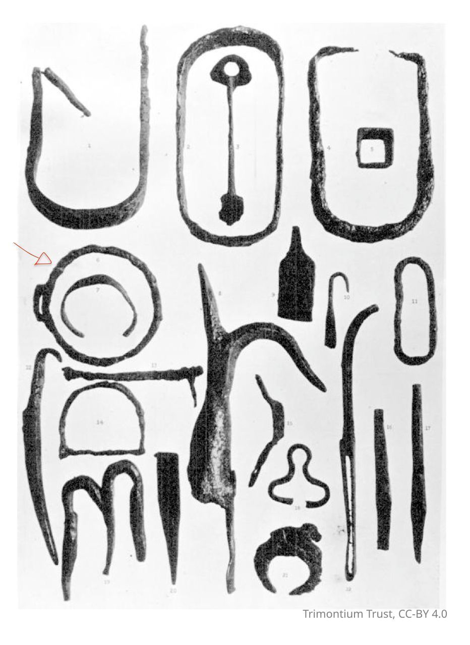 According to Curle: an iron rim with loops for a cross handle, may have belonged to a small bronze vessel.Use