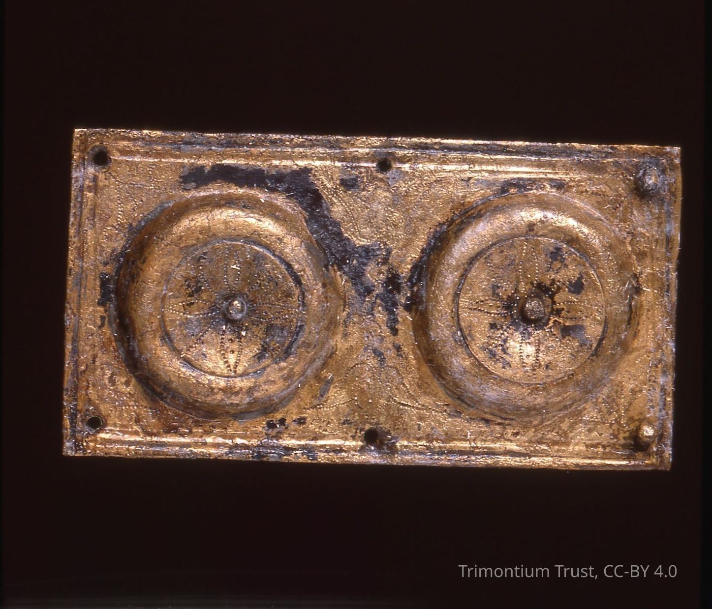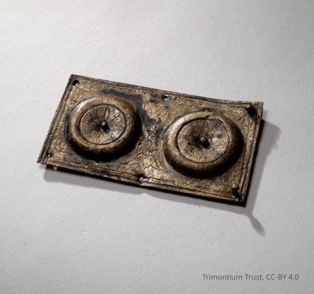 Saddle plate of brass, oblong with two panels with a boss in the centre of each, from the Roman site at Newstead (Trimontium), 80 - 100 ADUse