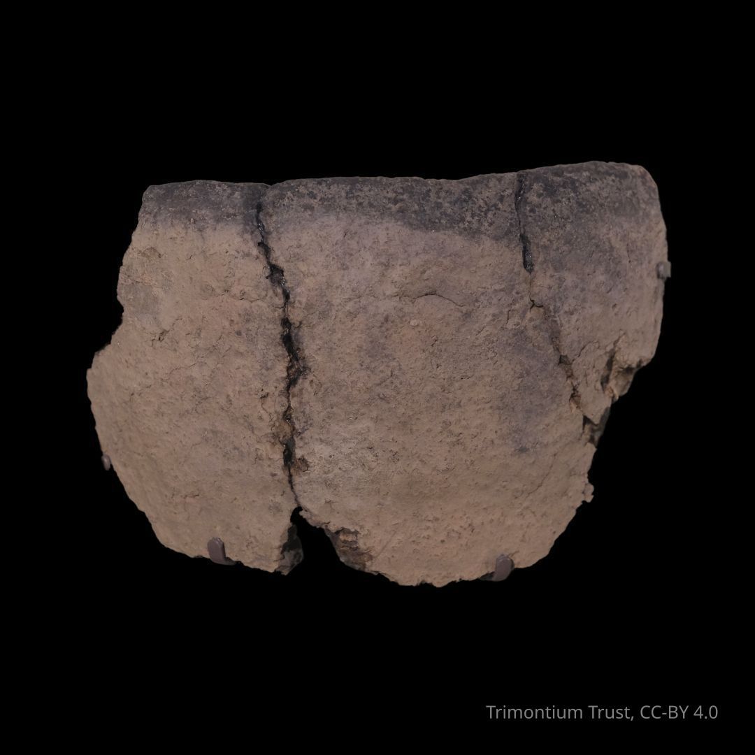 Wall and rim fragment of native pot, made from coils of clay. From Eildon Hill. Three parts reconstructed