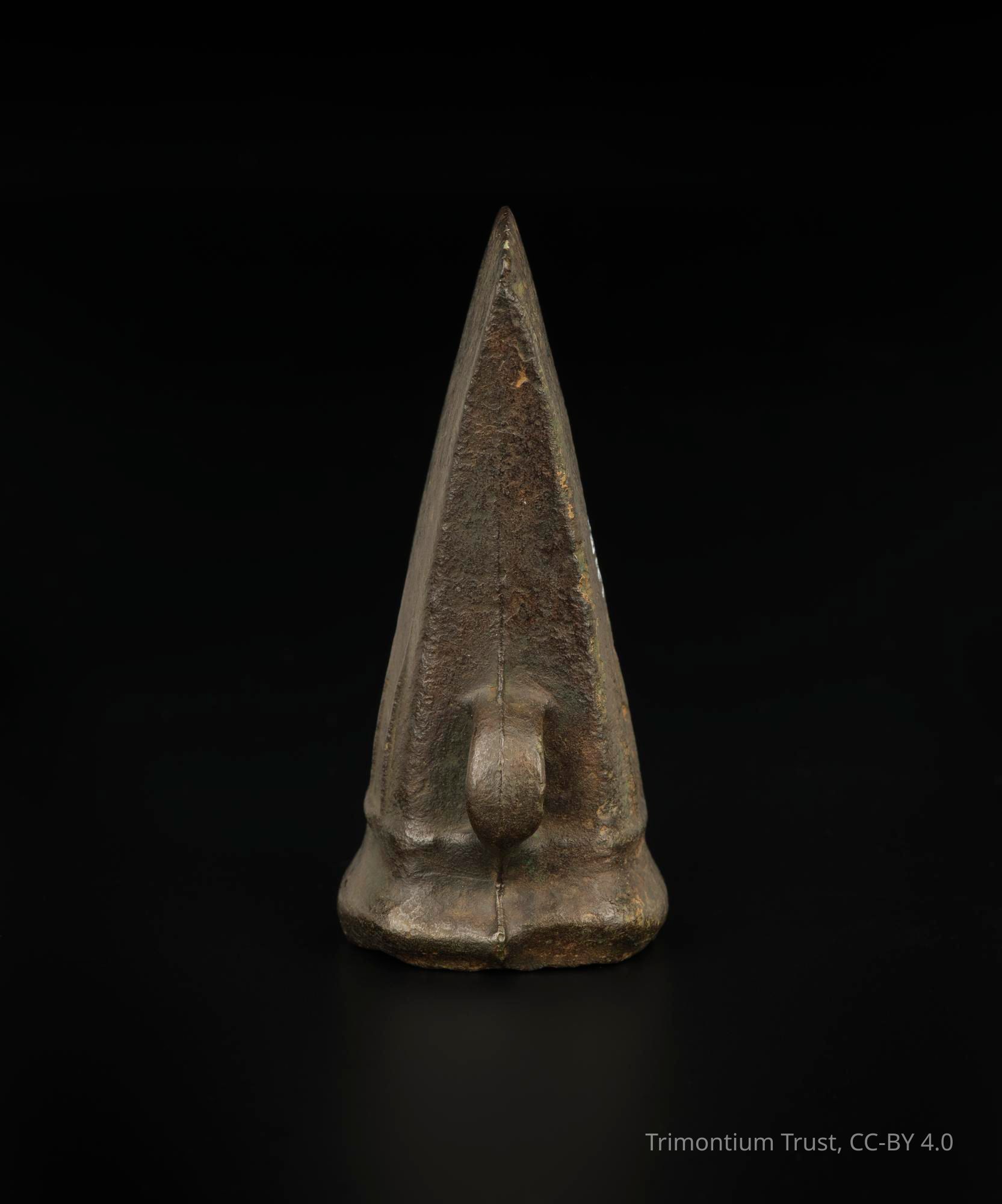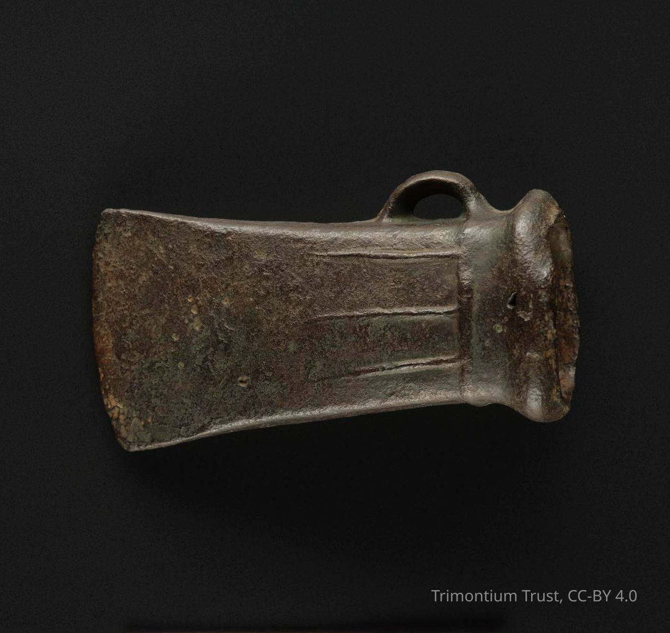 Socketed axe of bronze, with three ribs and a loop, late Bronze Age, found at Eildon Mid Hill, near Melrose.