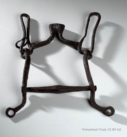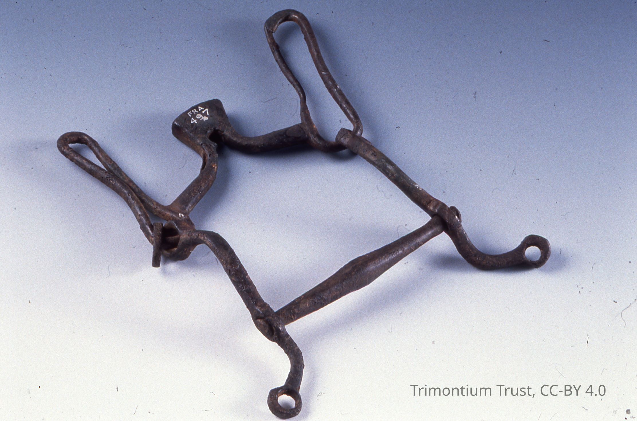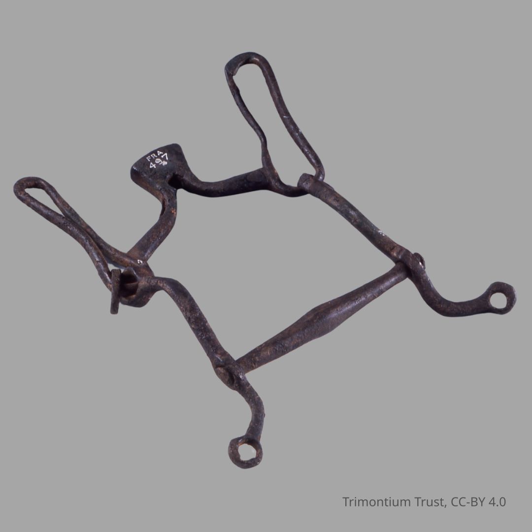 Roman curb bit of iron, from the Roman site at Newstead (Trimontium), 140 - 180 AD. Unusually well preserved. A type known as a curb bit: the projecting bar fits in the horse's mouth while the straight bar fits under its chin. The reins attach to the loops at the side.