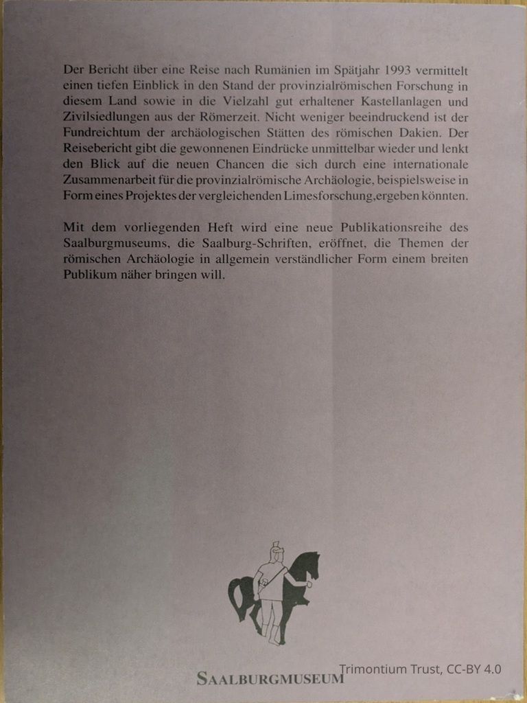 Von den Agri Decumates zum LImes Dacius reports on a trip to Romania in late 1993 and provides an insight into the state of provincial Roman research including; the well-preserved forts and civilian settlements from the Roman period and the wealth of finds at the archaeological sites of Roman Dacia. The report draws attention to the new opportunities that arise from international cooperation for provincial Roman archaeology, for example in the form of a project on comparative Limes research. This booklet marks the beginning of a new publication series from the Saalburg Museum, the Saalburg-Schriften, which aims to bring the topics of Roman archaeology closer to a broad audience in a understandable form.Lexicon