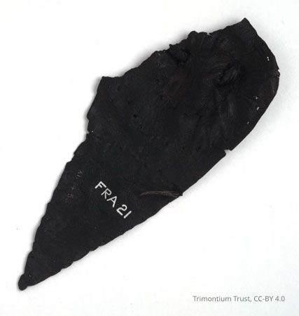 Piece of tent, a pointed oval tab of leather with a thong knotted through it, from the Roman site at Newstead (Trimontium), Roxburghshire, 80 - 180 AD
