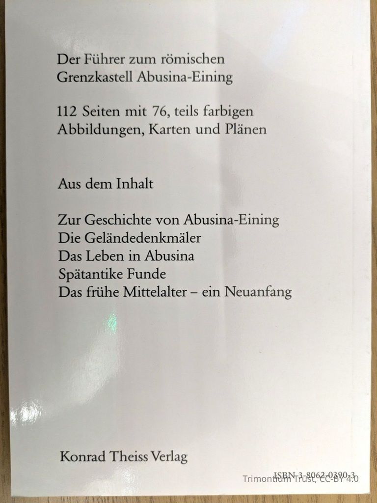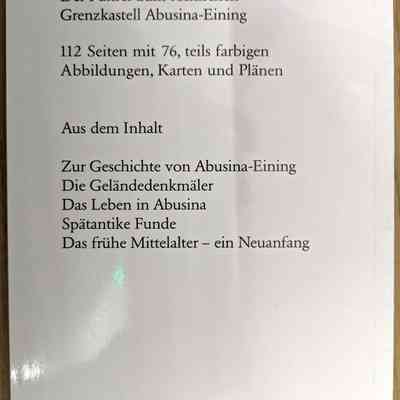 Das römische Grenzkastell Abusina-Eining is a guide to the Roman border fort of Abusina-Eining one of the archaeological sites in Lower Bavaria. The fort/camp of Abusina is located on the southern outskirts of Eining, directly on the road to Bad Gögging. In Roman times, the River Danube flew right here, where today the bed of the River Abens lies.Lexicon