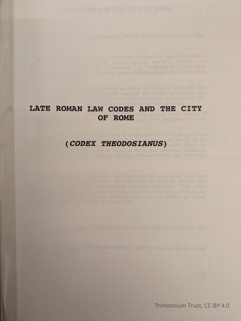 Late Roman Law Codes and the City of Rome are a collection of law texts relating to the city of Rome, extracted from C. Pharr; "The Theodosian Code and Novels and the Sirmondian Constitutions", New York, 1952. Supported by J. Harries & I. Wood (Editor); "The Theodosian Code: studies in the imperial law of late antiquity, London, 1993. The Codex Theodosianus was a collection of extracts of imperial legislative acts made by emperors from Constantine I to Theodosius II (AD 312-435) published in AD 438.Context