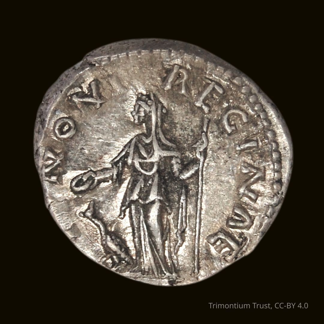 Reverse: IVNONI REGINAE, Juno standing left, holding patera and sceptre, peacock at feet left