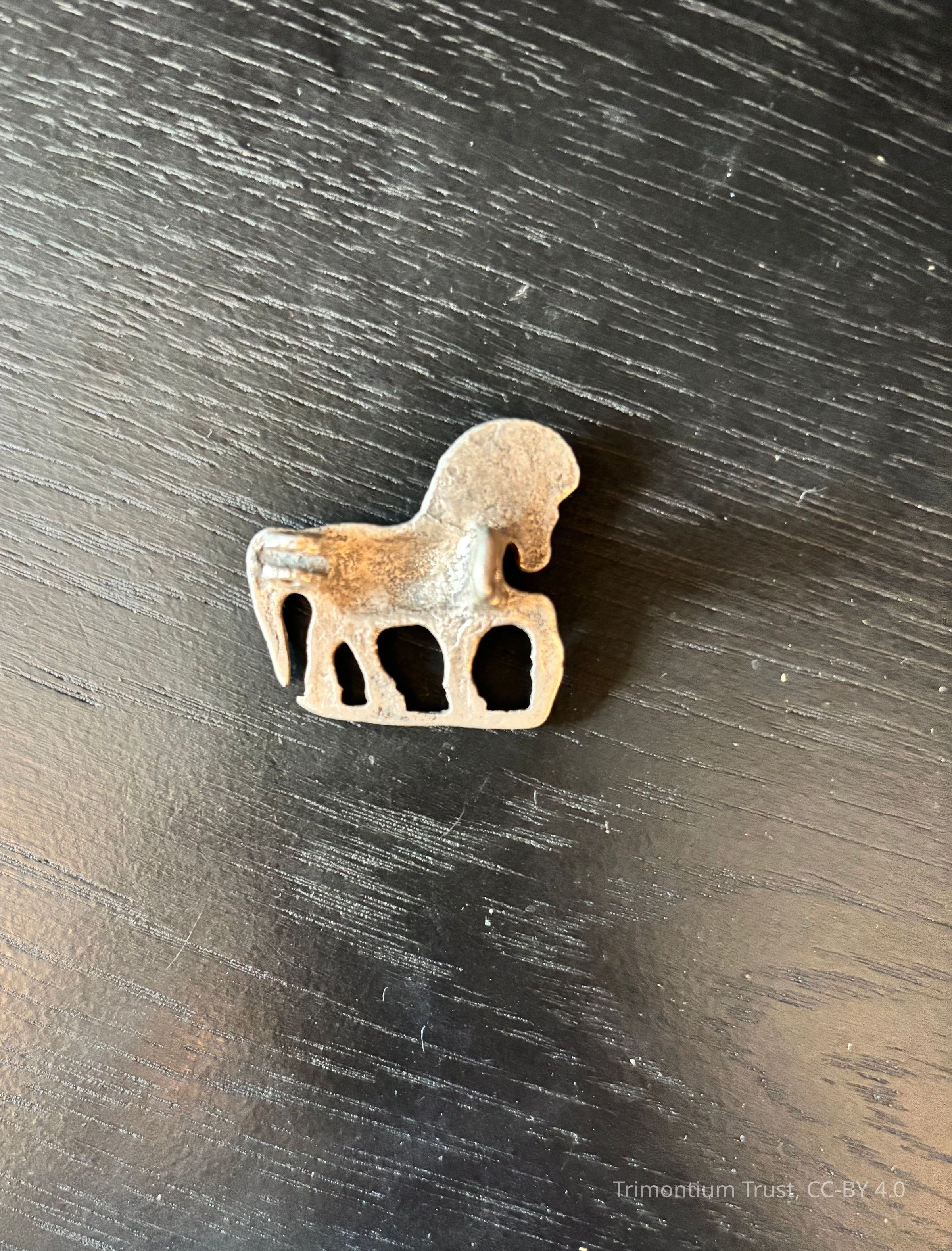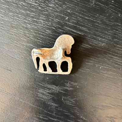 Silver toned brooch in the shape of a horse, missing the pin of the brooch but the latch and part of the hinge is intact.Style