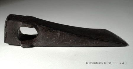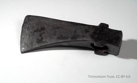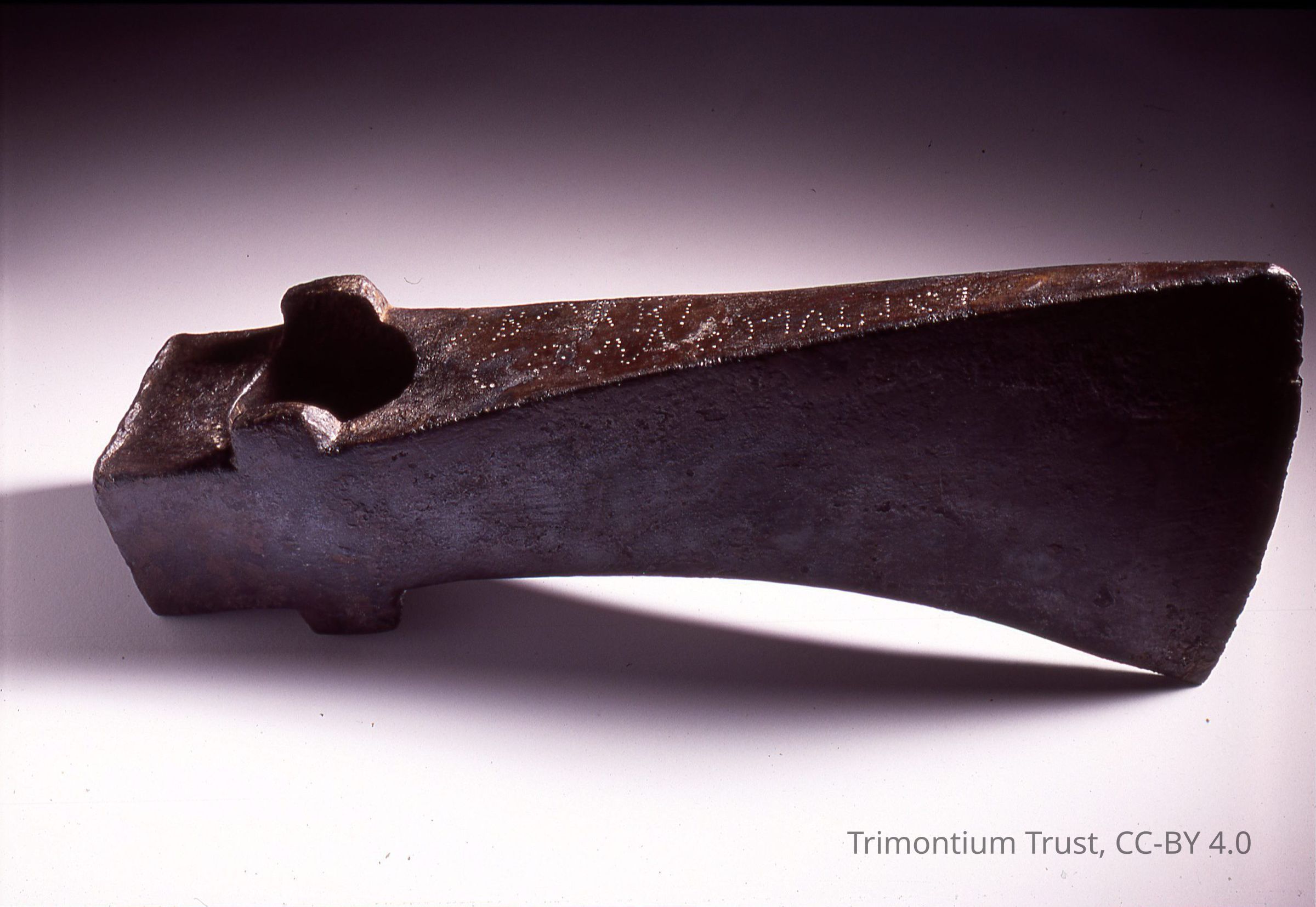 Heavy axehead of iron, for felling or shaping. The axehead was made by forging a solid piece of iron, the eye having been punched out. On the lower side of the square end is impressed a stamp with the letters L.G.R.