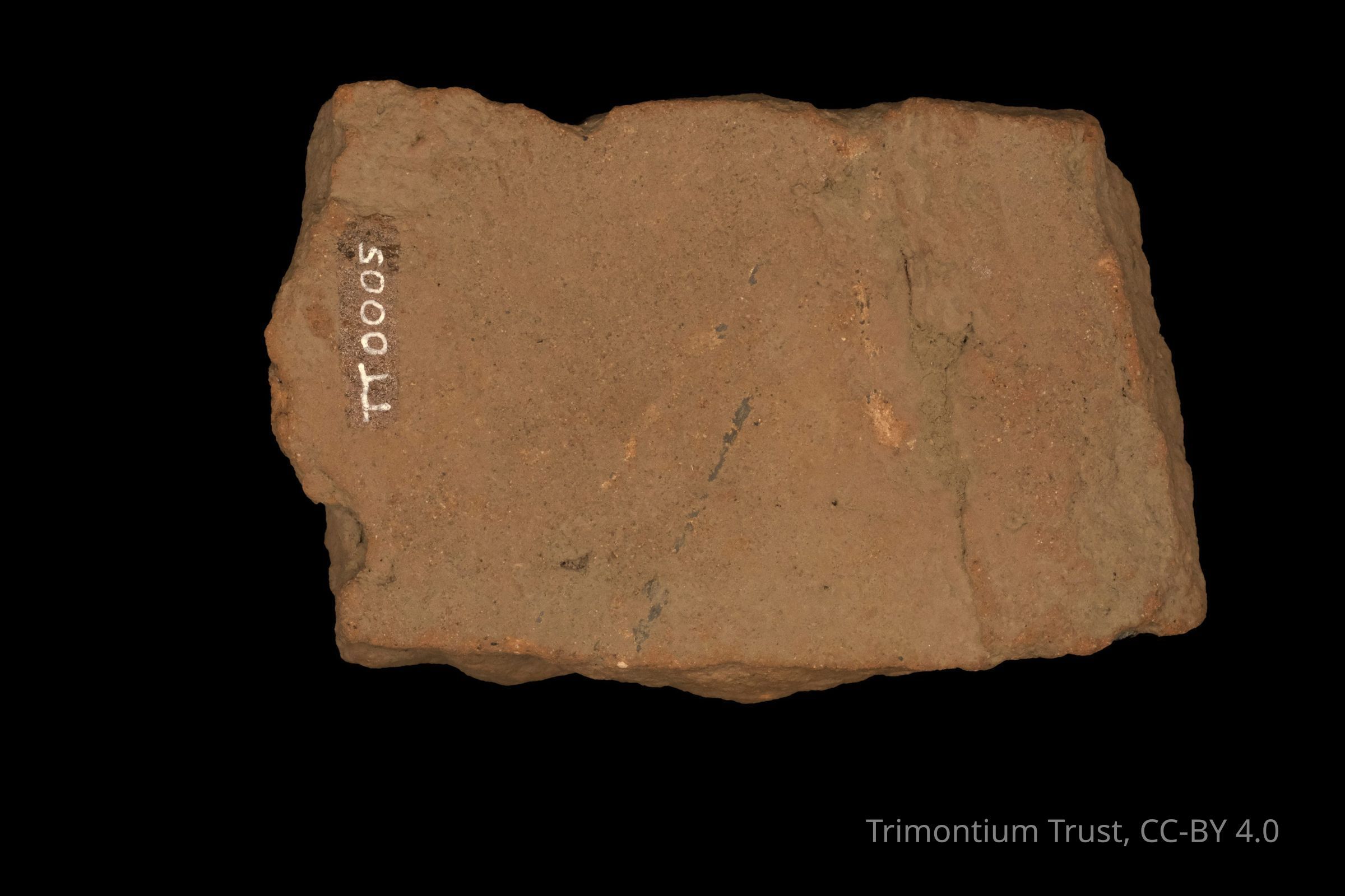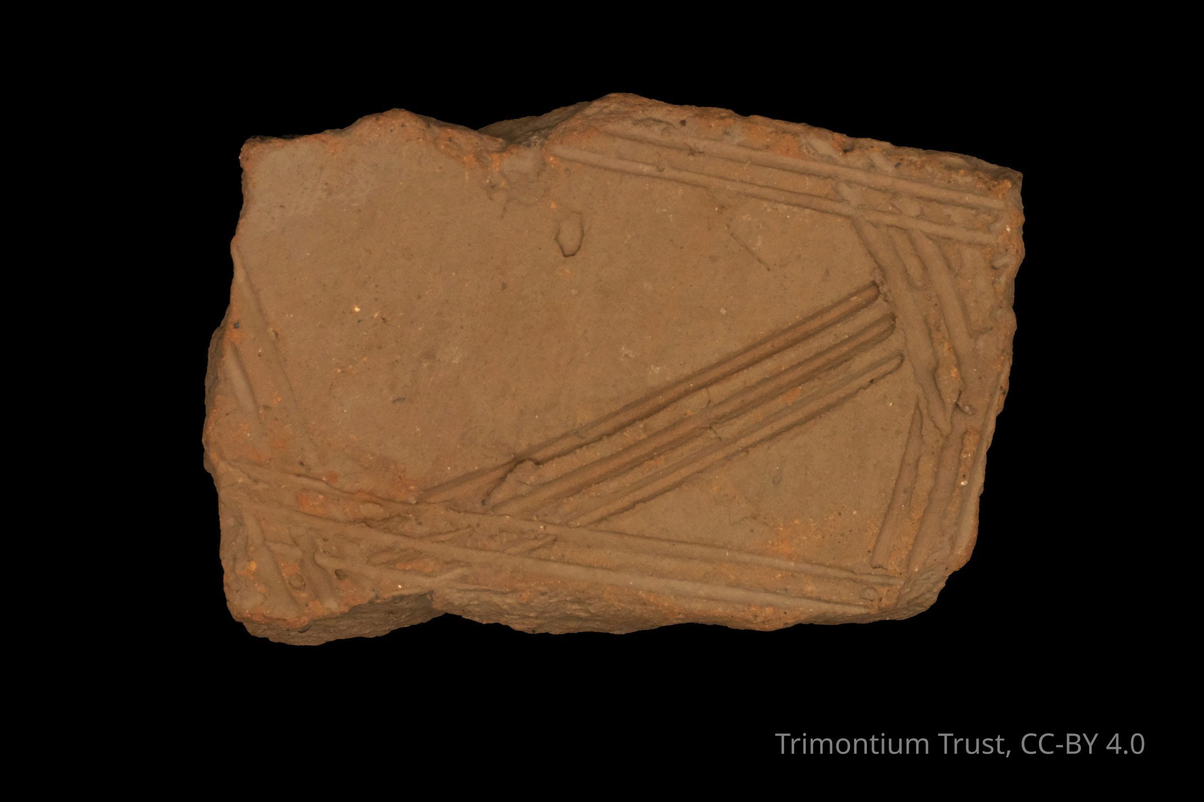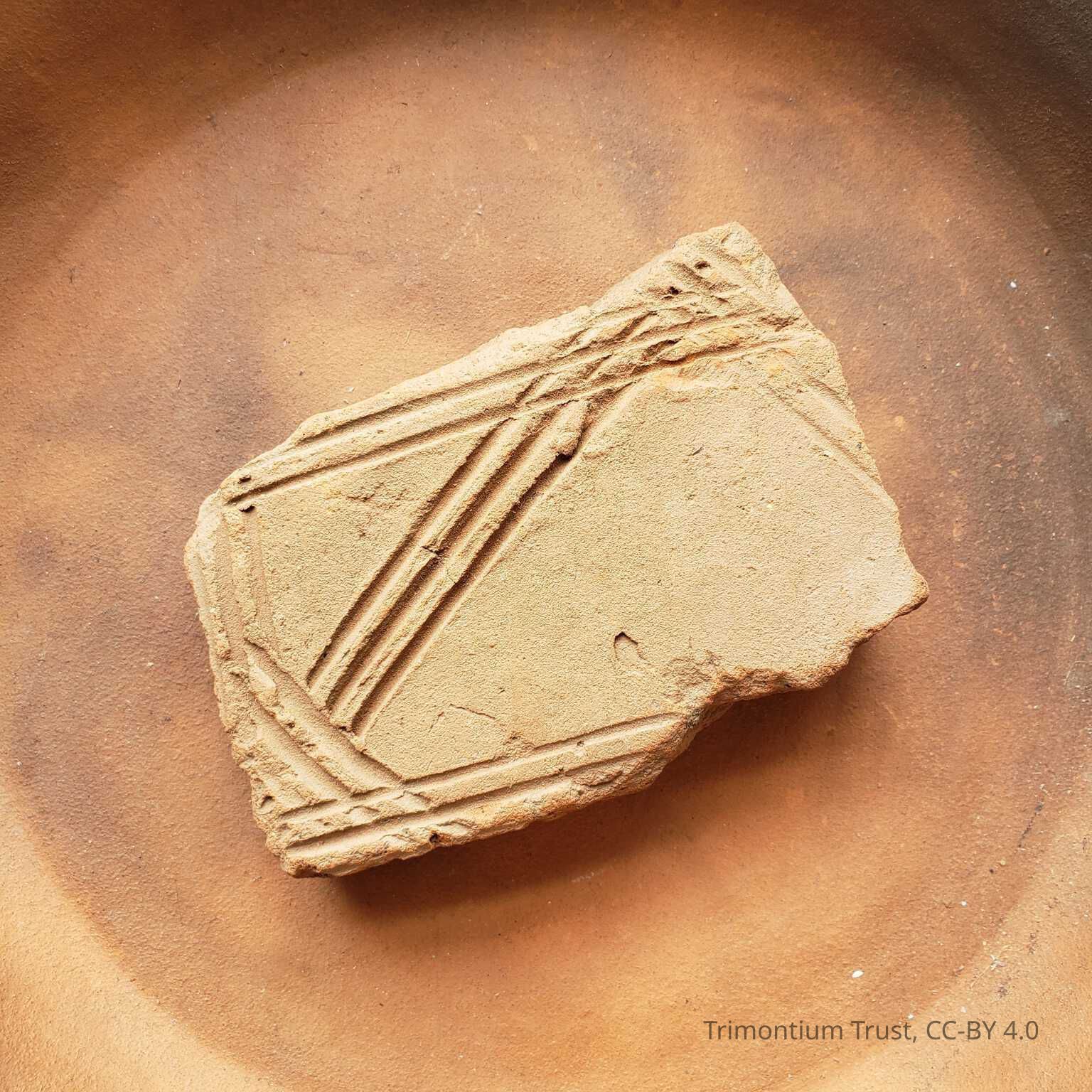 Scored hypocaust tile with three diagonal line incisions cutting across one surface, meeting two parallel horizontal lines on the top and bottom of surface.
