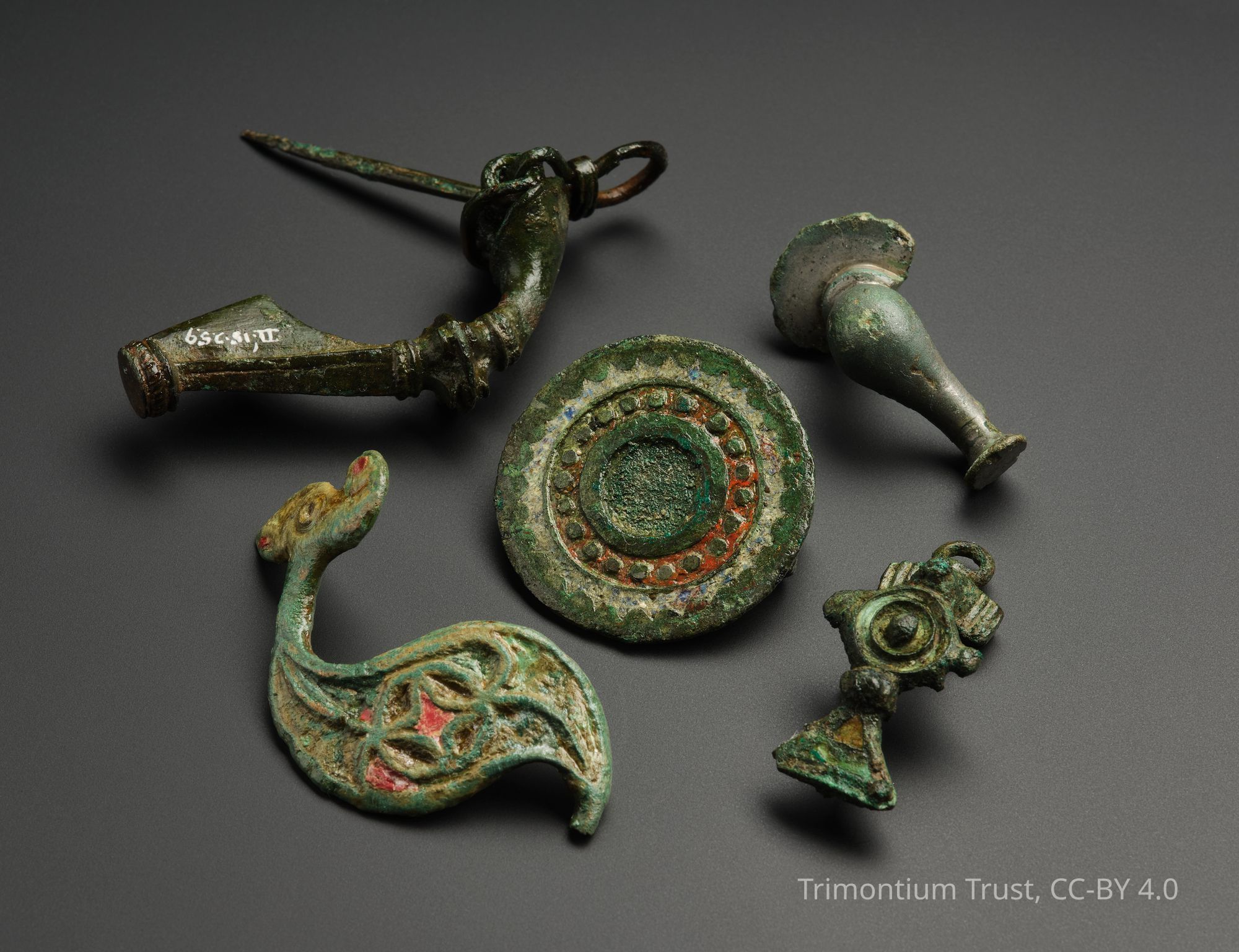 Brooches were clothing-fasteners worn like safety pins, by men and women. They also served as fashion accessories and symbols of status. They were made in many different designs. The ‘dragonesque’ type with animal heads is influenced by Celtic art and is typical of Roman Britain. The trumpet-shaped brooches are also British designs.