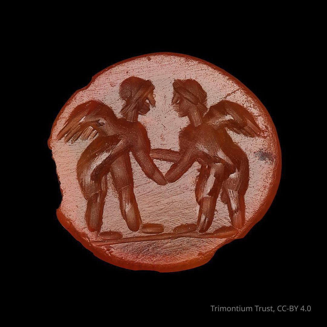 Carnelian intaglio showing two cupids wrestling, cap-with-rim style, 2nd century, part of the Cruickshank collection of finds from Newstead, Roxburghshire.Style