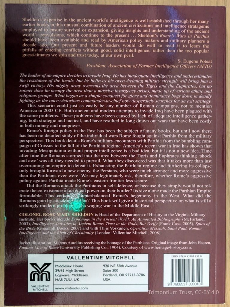 Rome's Wars in Parthia details Rome's military encounters with Parthia from the bumbling campaign of Crassus to the fall of the Parthian regime. America's recent war in Iraq has shown that invading Mesopotamia without proper intelligence is a bad idea, but it is not a new idea. Time after time the Romans stormed into the area between the Tigris and Euphrates thinking 'shock and awe' was all they needed to prevail. What they discovered was that it takes more than just overrunning an empire to defeat it. The analysis of the consequences of the frequent conflicts on the political, economic, and military health of both empires, is quite useful, and observes that the occasional diplomatic solutions often proved more beneficial than any of the wars.Lexicon