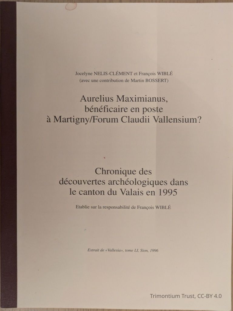 Extract from the Journal Vallesia, volume 51, Sion 1996. Reprinted with the support of the Canton of Valais and the Fondation Pierre Gianadda Martigny, Switzerland. Aurelius Maximianus, bénéficiare en poste à Martigny/Forum Claudii Vallensium? is the subject of the Annual Bulletin of the Library and Cantonal Archives of Valais, of the Museums of Valère and Majoria.Lexicon