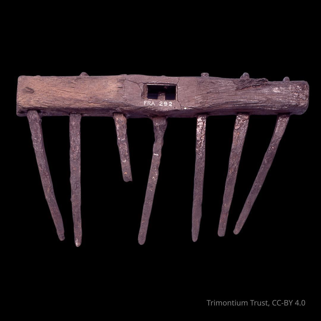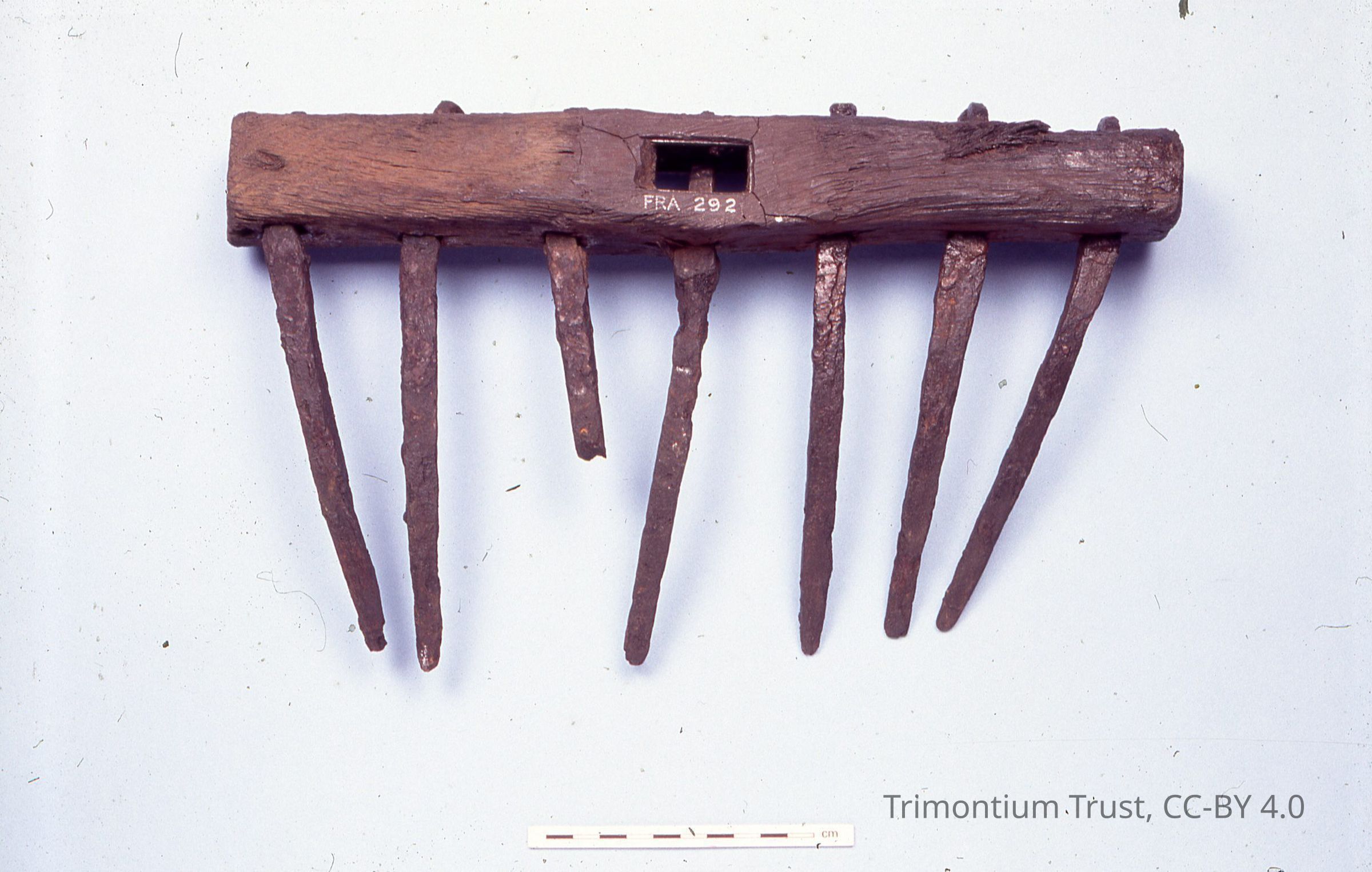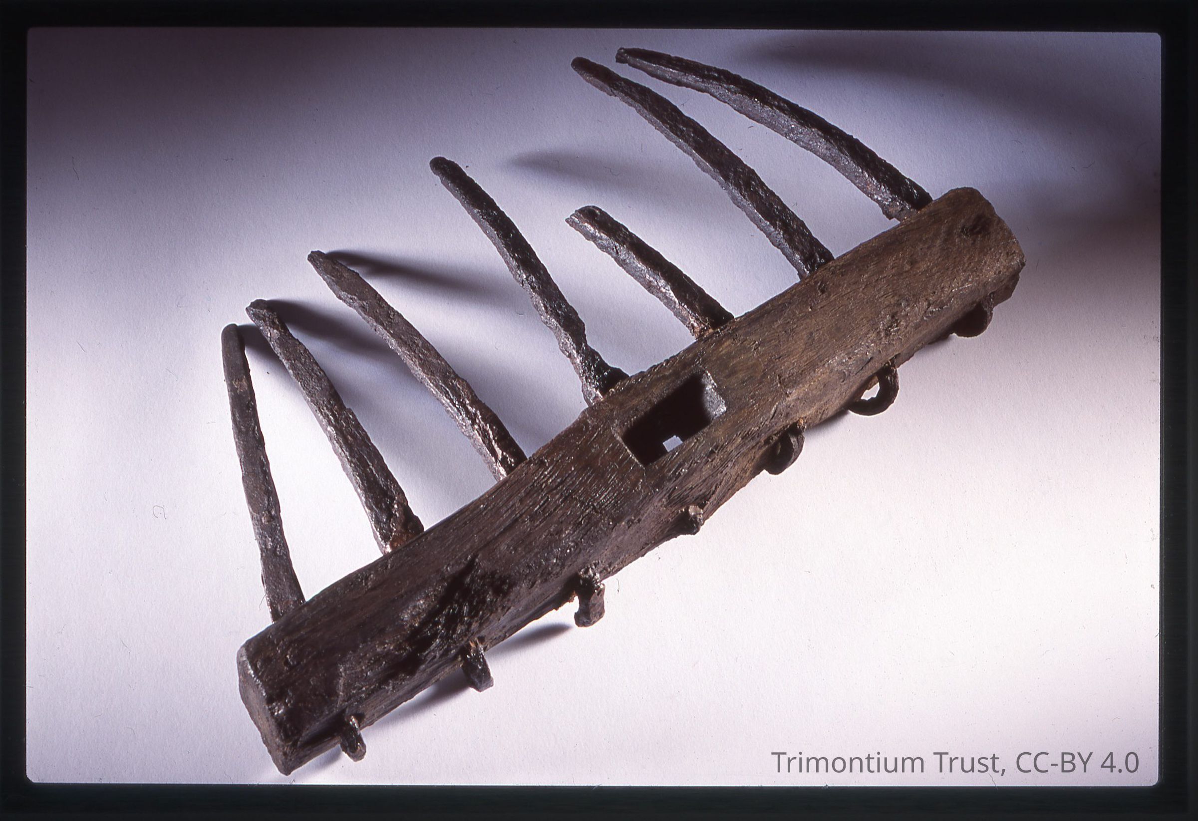 Rake head of wood (oak) with iron prongs, from the Roman site at Newstead (Trimontium).