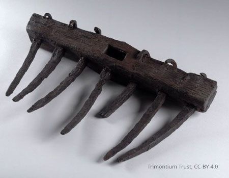 The iron prongs are slightly curved. They fasten to the wooden head by doubling over the lower edge. A wooden handle would have been inserted into the central slot. 80 - 180 ADUse