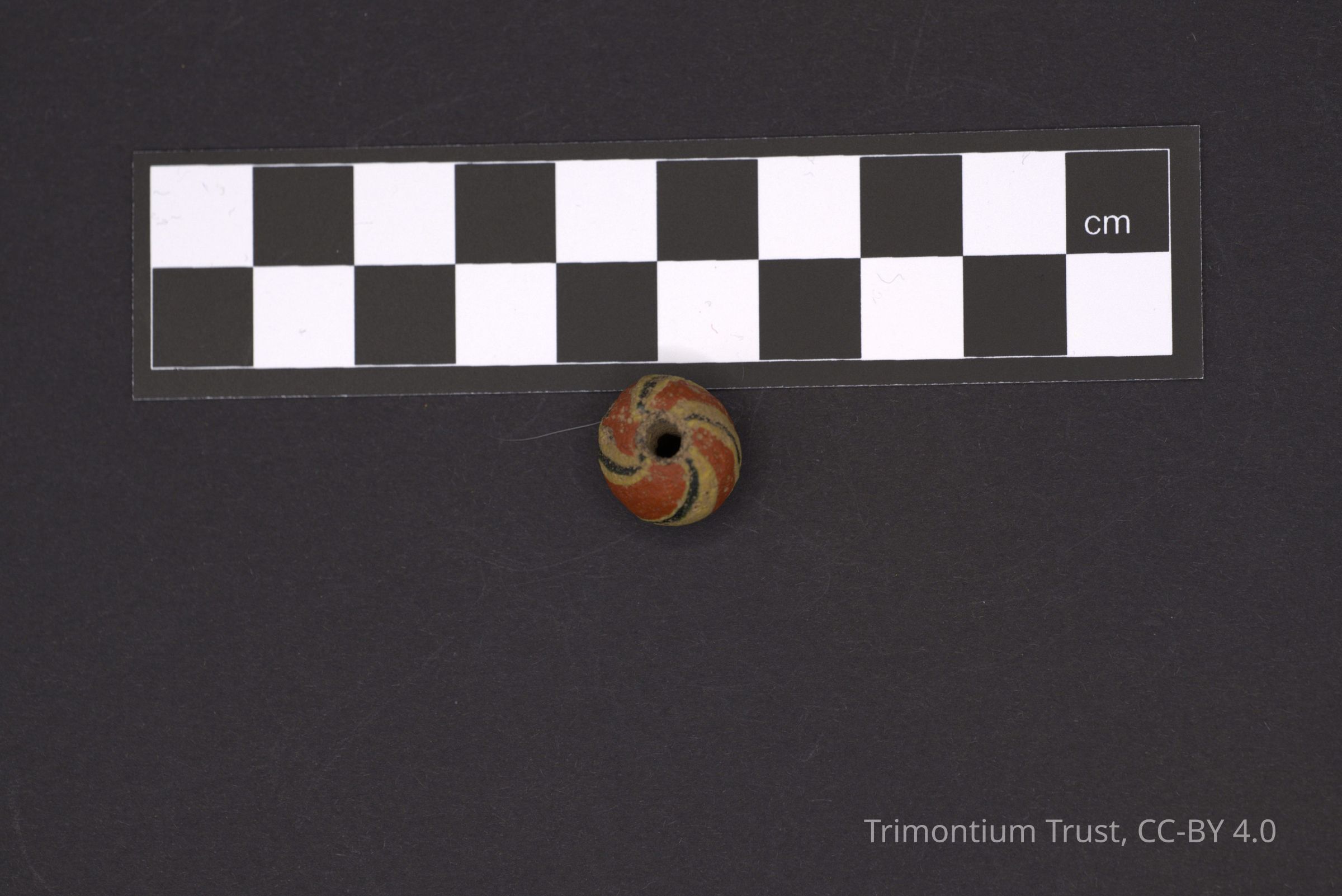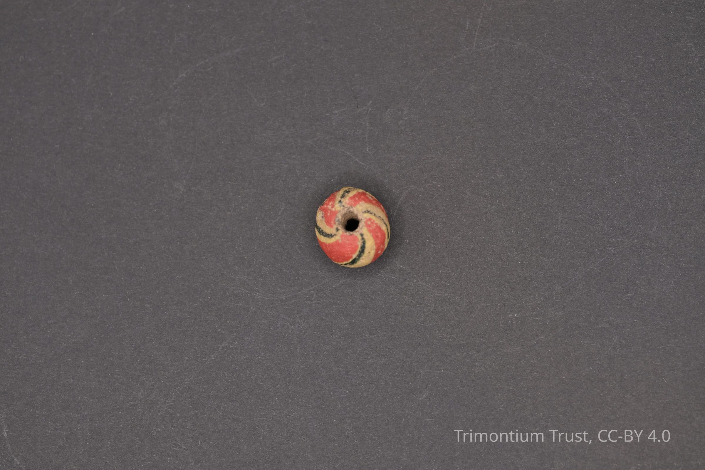 Red, yellow, blue swirl design clay or faience bead, Celtic type, from Trimontium