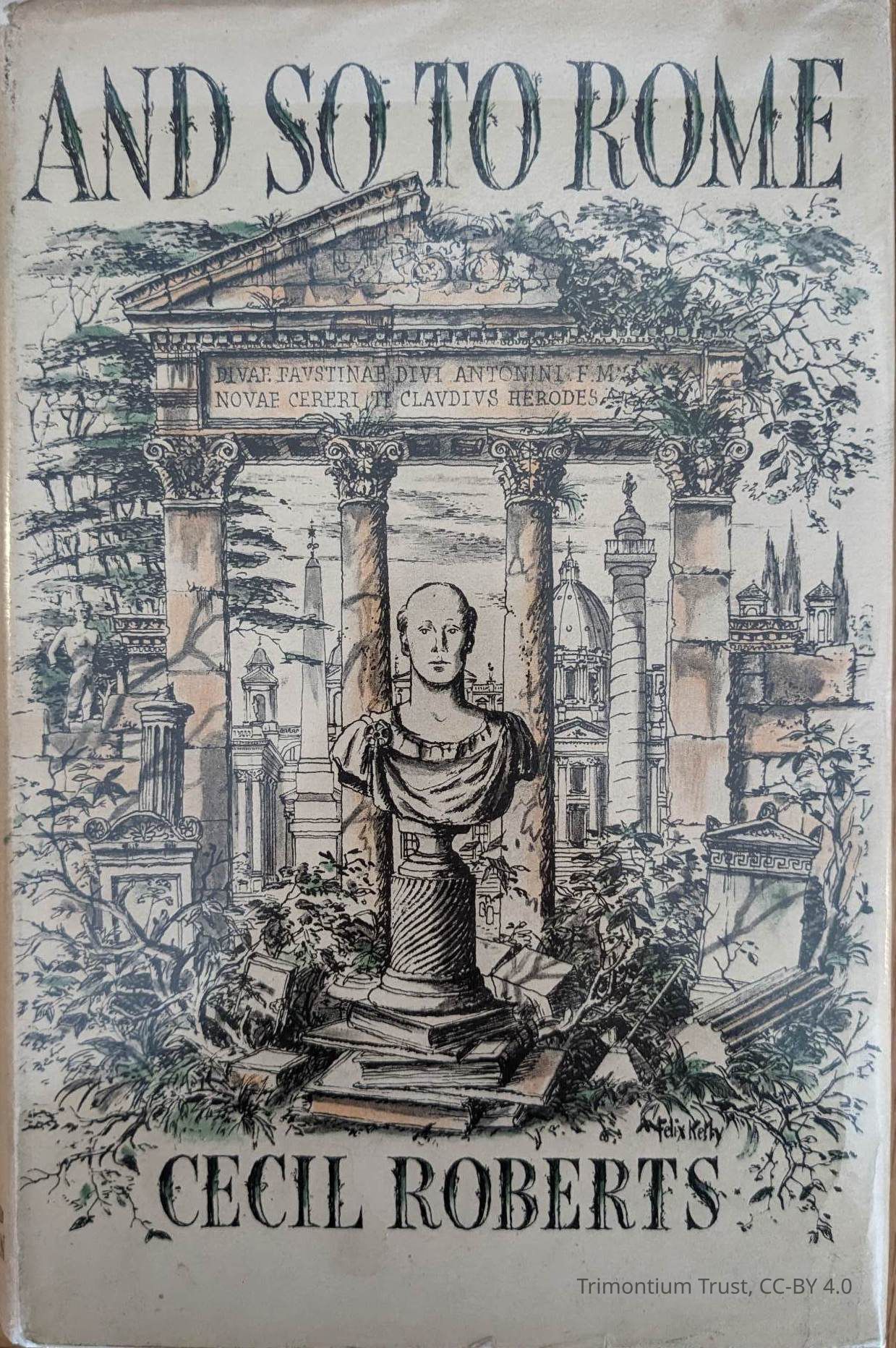 Book cover with a drawing of a crumbling Roman Forum and a Roman bust.