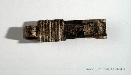 Brass junction loop from the Roman site at Newstead (Trimontium), 80 - 100 AD. Band at upper end decorated with horizontal mouldings.