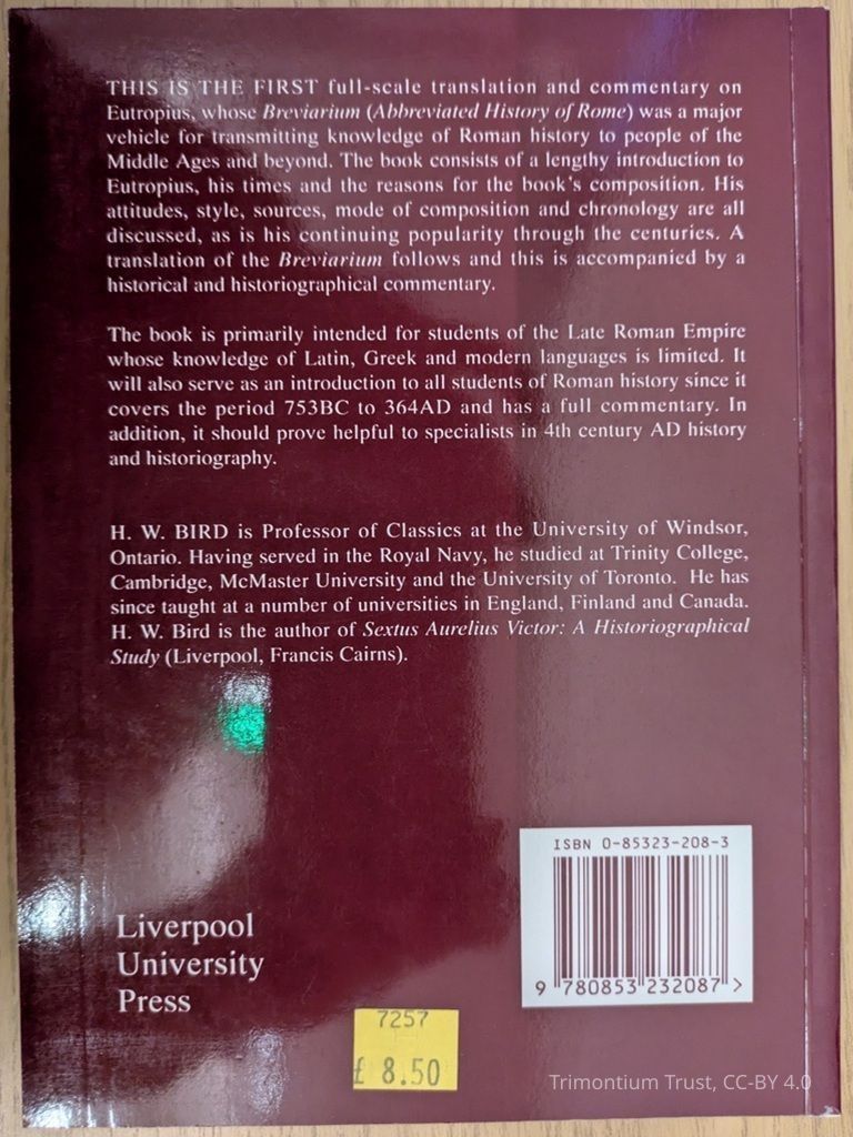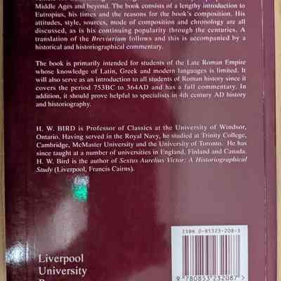 Eutropius Breviarium (Abbreviated History of Rome) was a major vehicle for transmitting knowledge of Roman history to people of the Middle Ages and beyond. The book consists of a lengthy introduction to Eutropius, his times and the reasons for the book's composition. His attitudes, style, sources, mode of composition and chronology are all discussed, as is his continuing popularity through the centuries. A translation of the Breviarium follows and this is accompanied by a historical and historiographical commentary. The book is primarily intended for students of the Late Roman Empire whose knowledge of Latin, Greek and modern languages is limited. It will also serve as an introduction to all students of Roman history since it covers the period 753 BC to AD 364 and has a full commentary. In addition, it should prove helpful to specialists in 4th century AD history and historiography.Context