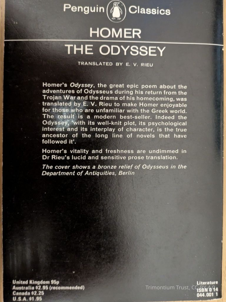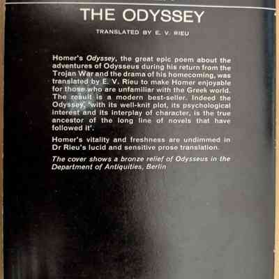 Homer's Odyssey, the great epic poem about the adventures of Odysseus during his return from the Trojan War and the drama of his homecoming, wa translated by E. V. Rieu to make Homer enjoyable for those who are unfamiliar with the Greek world. The result is a modern best-seller. Indeed the Odyssey, with its well-knit plot, its psychological Interest and its interplay of character, is the true ancestor of the long line of novels that have followed it.Context