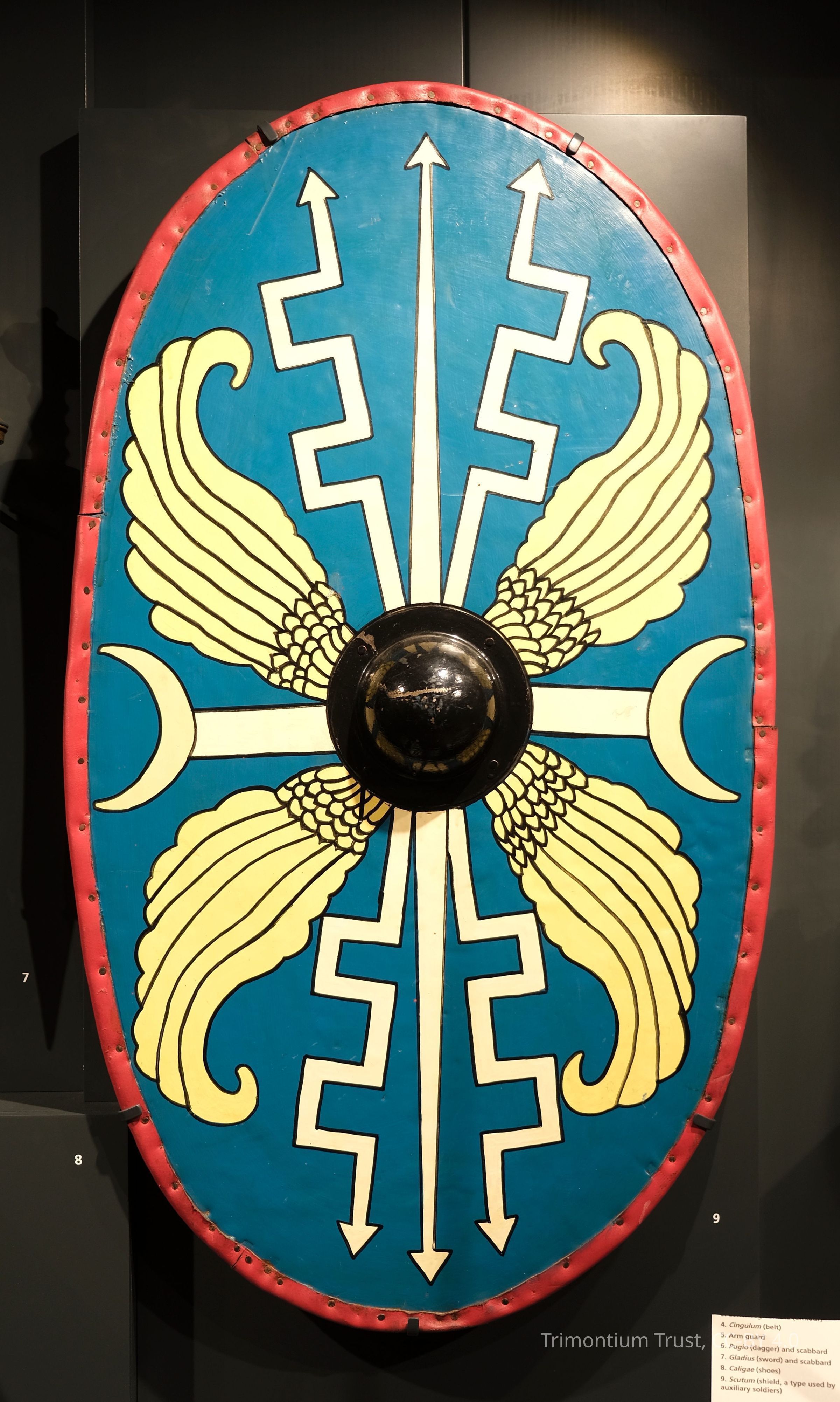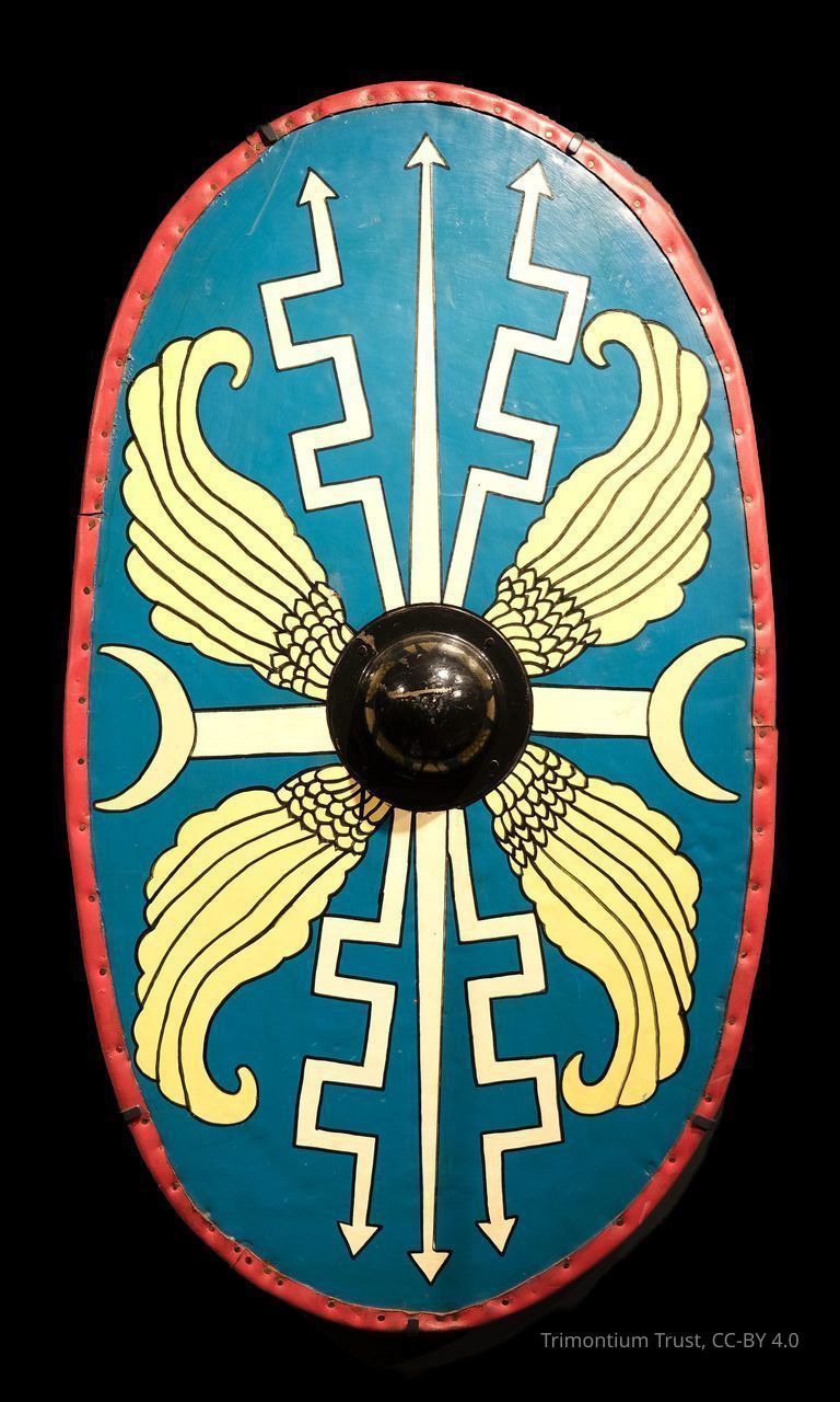 Replica scutum, a shield used by legionary soldiers, blue oval shaped with black shield boss and four yellow wings (representing eagles), 4 yellow bolts (symbol of Jupiter), yellow arrow running vertically through centre, yellow crescent moons on either side (symbol of Diana).Use