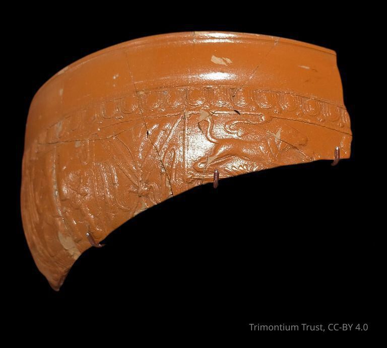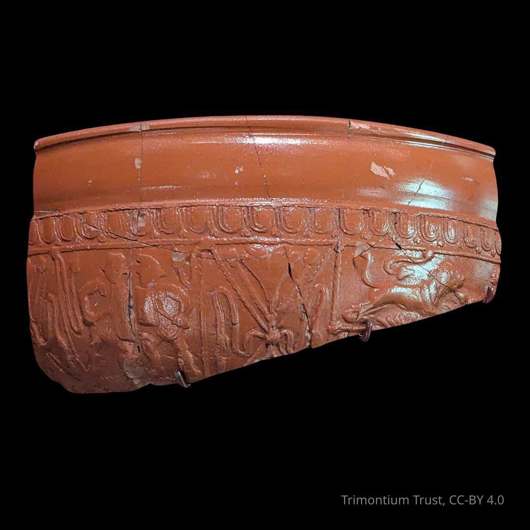According James Curle's publication on the excavation at Newstead, this bowl fragment belongs to the Flavian Period and was found in the ditch of the early fort at Newstead. His description of the fragment is as follows: "Fragment of a bowl (Dragendorff 37). Egg and tassel moulding. The surface divided into panels: (1) Portion of the cruciform ornament common at this period. (2) Two gladiators in combat. A Samnite or secutor on the left. He wears a large plumed helmet; bands of leather protect his thighs; he carries an oblong shield and a short sword. A Thrax opposes him with smaller shield and short curved blade, the sica. (3) The cruciform ornament is repeated. (4) Incomplete, a lion attacking a bestiarius; above the lion, a tendril ending in a pointed leaf; beneath it, a bunch of herbage." (Curle, 1911: 206-7)