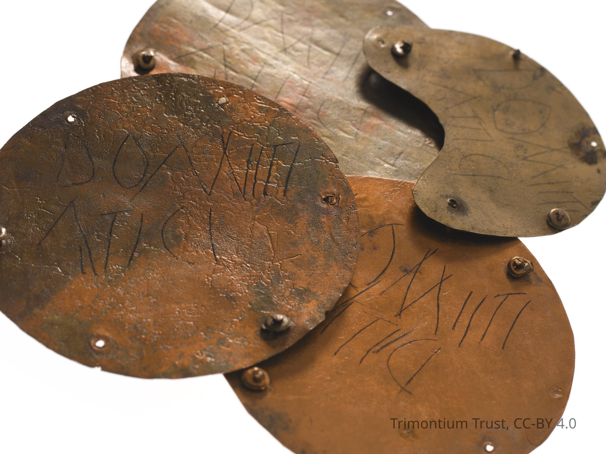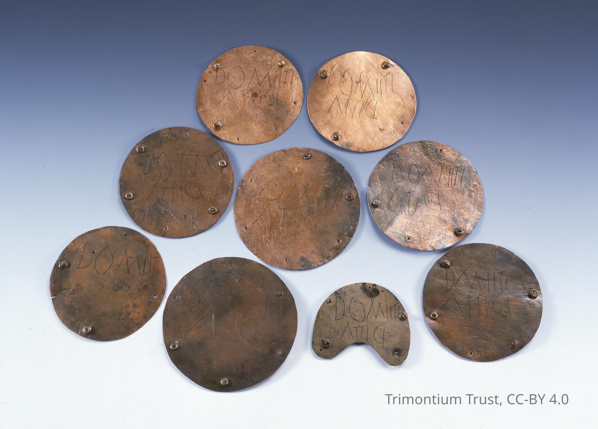 Nine backing plates for phalerae of bronze, with owner's name 'DOMIITI ATTICI', from the Roman site at Newstead (Trimontium), Roxburghshire, 80-100 AD