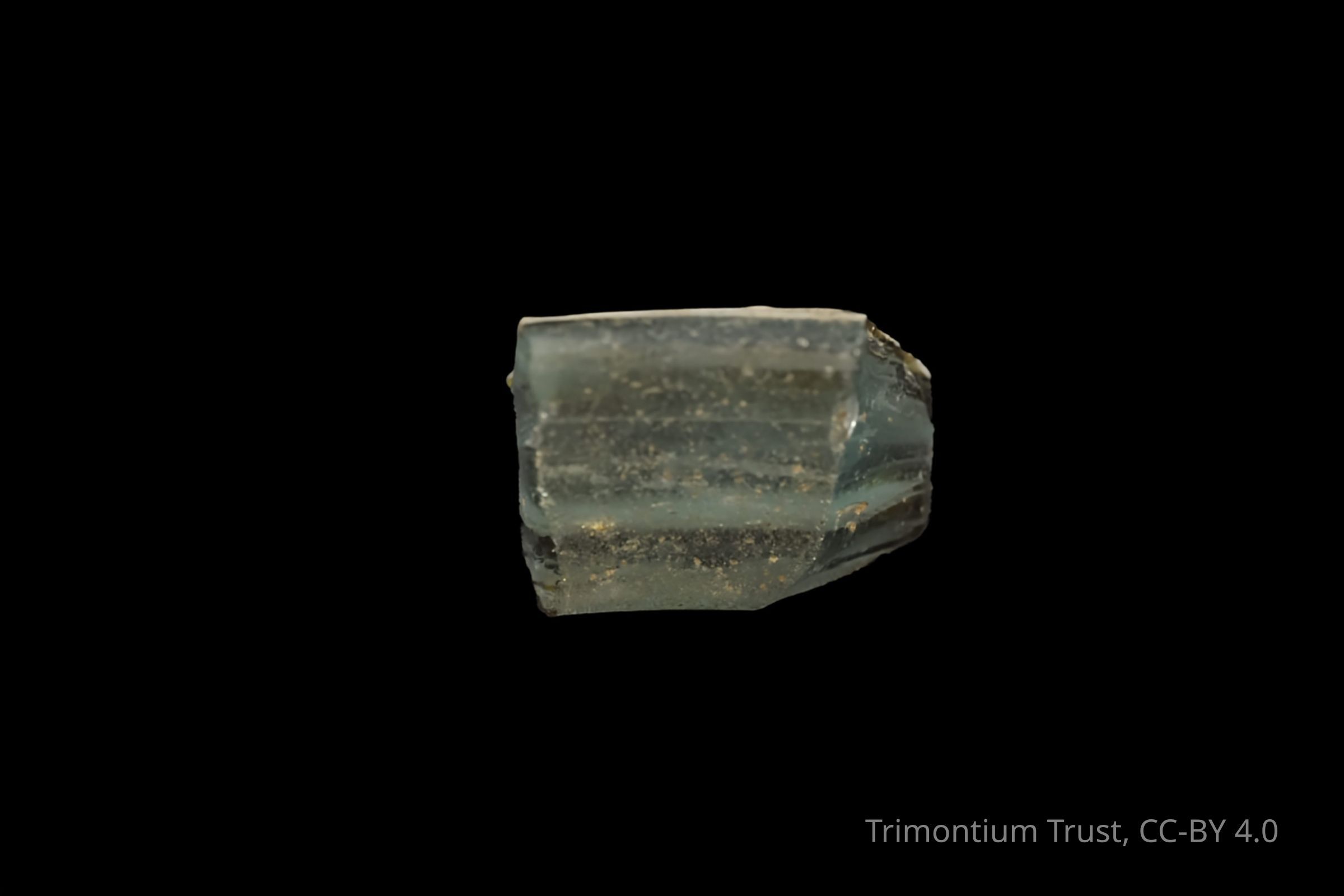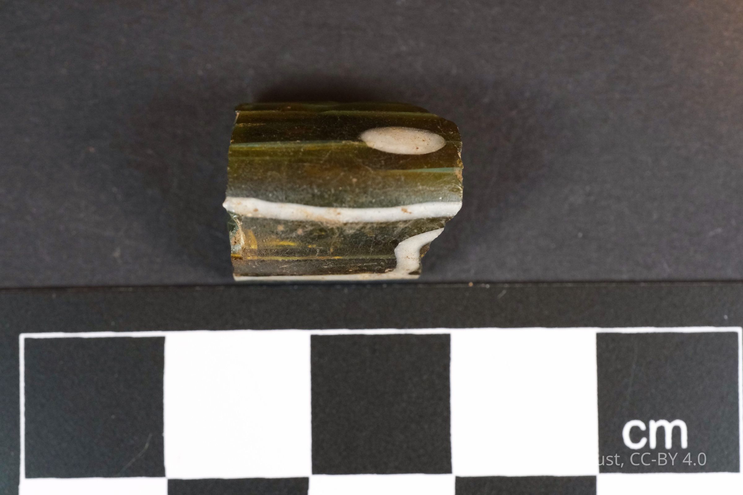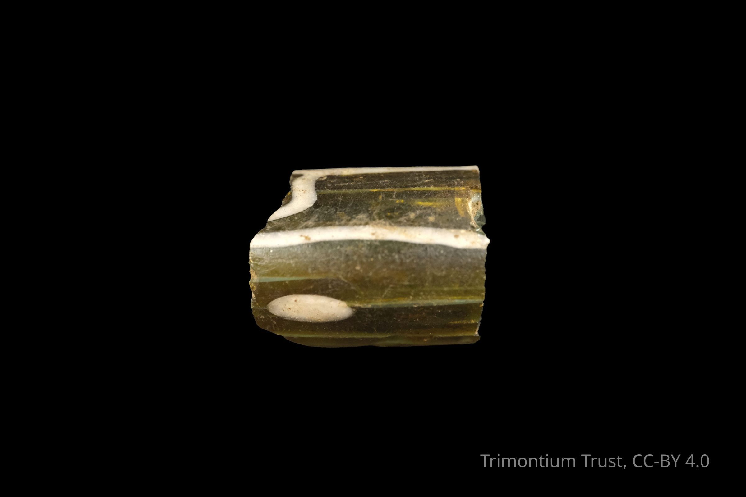 Fragment of light green glass armlet overlaid with olive green, white lines and dots