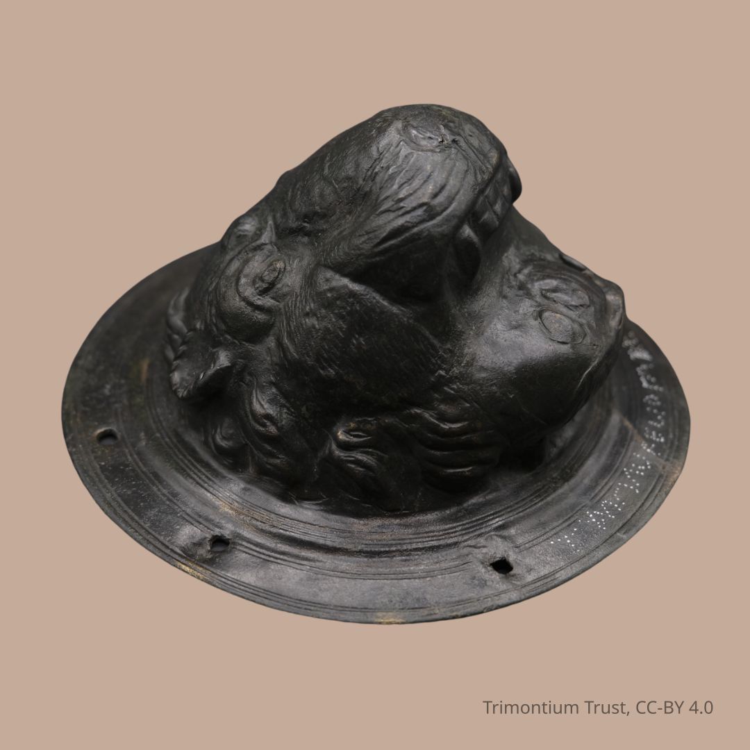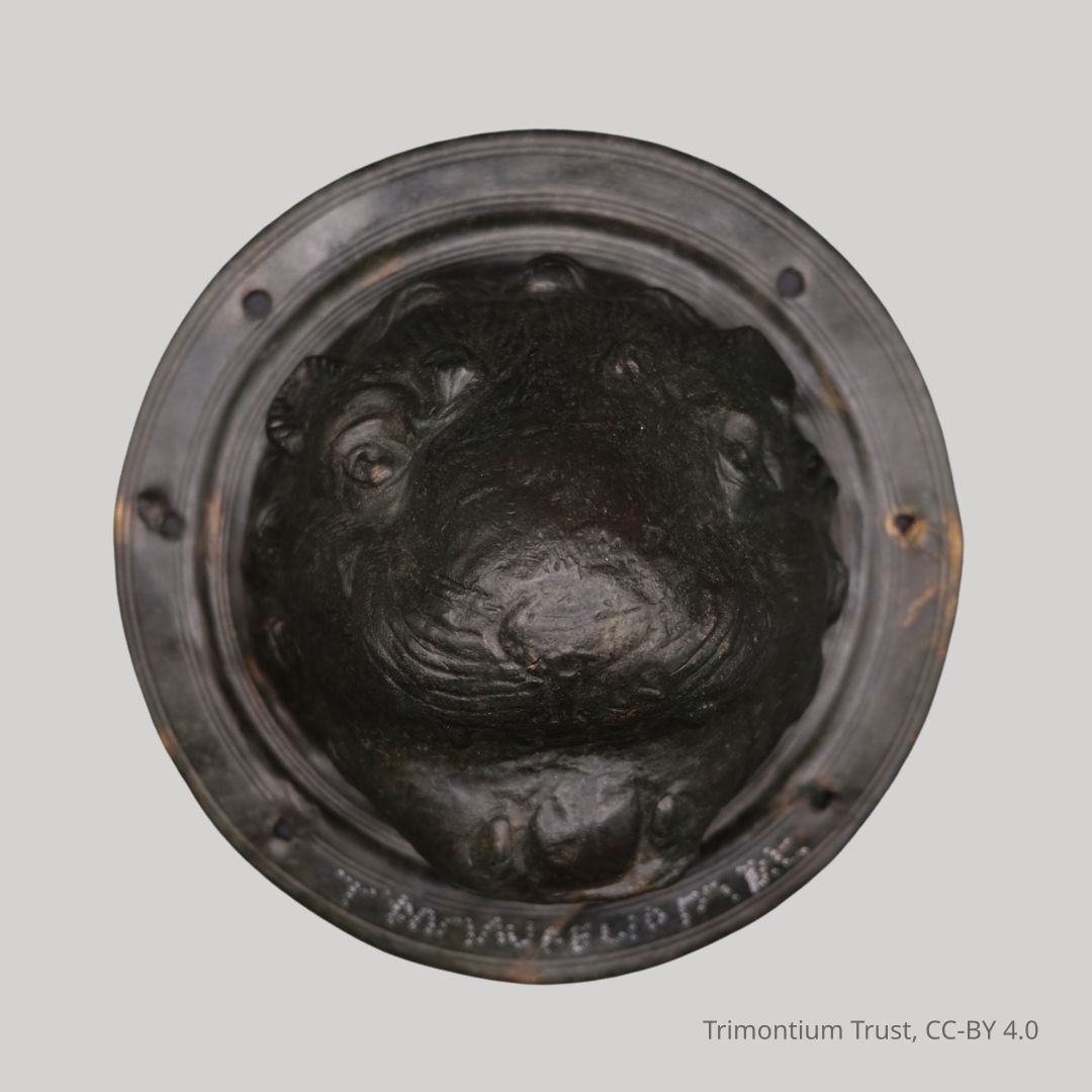 Round Shield boss depicting a Lion's head (highly embossed execution) with a punched ownership inscription (indicating a Turma cavalry unit)
