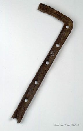 Flat L-shaped object of iron with five nail holes in the longer arm, from the Roman site at Newstead (Trimontium)Use