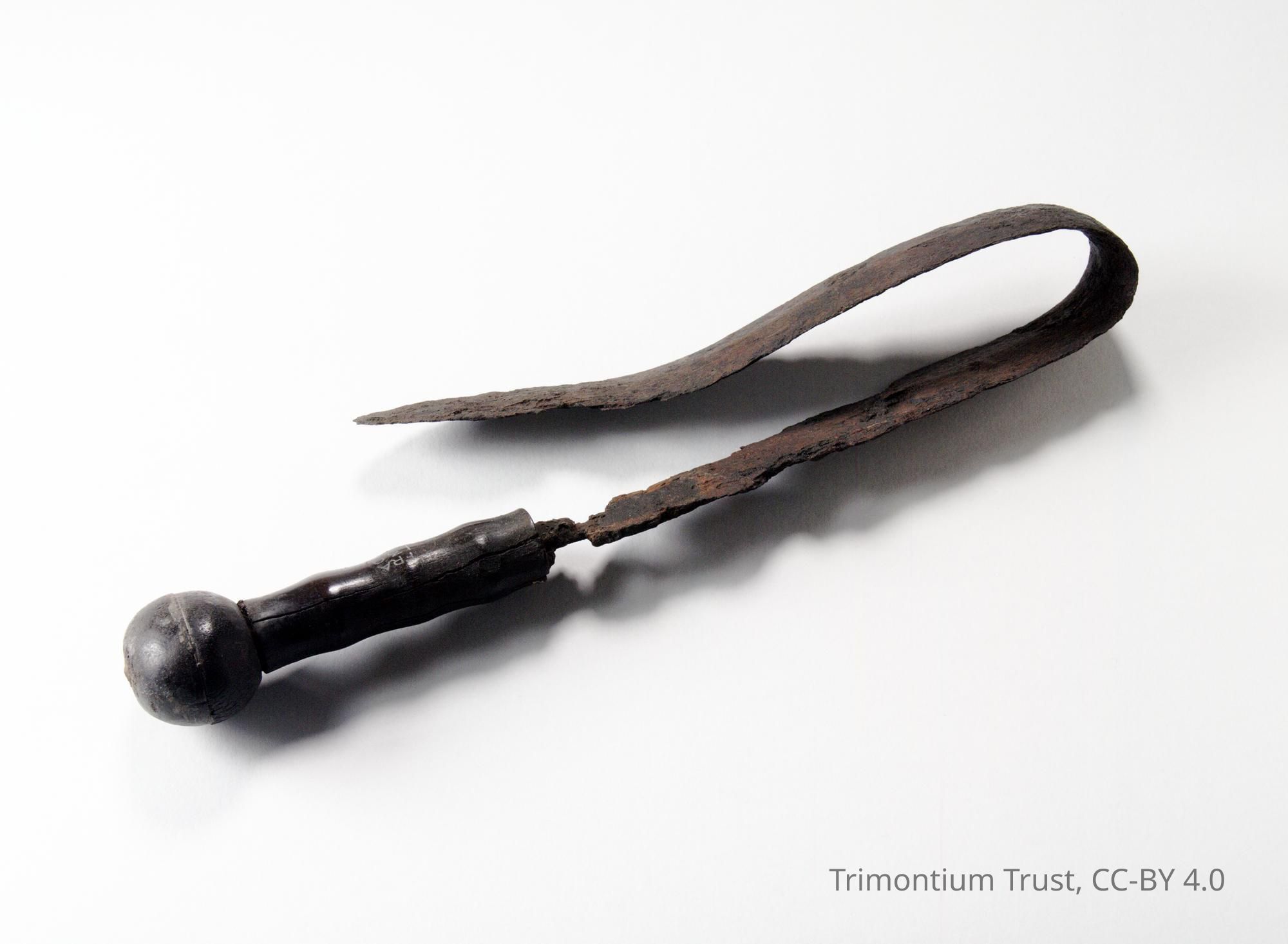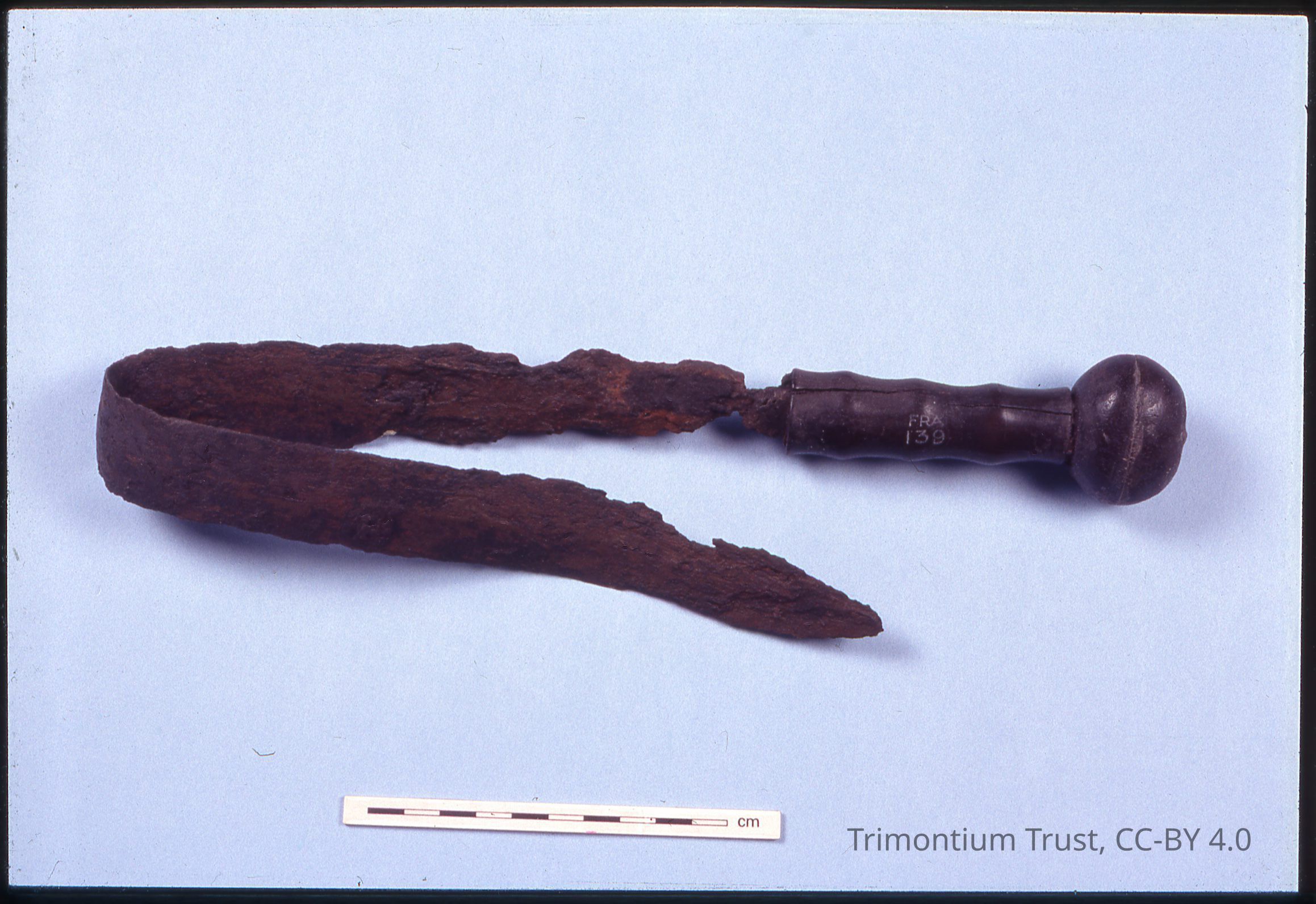 Iron sword with bone hilt, doubled up. 80-100 AD. The grip has ridges and flutings.It terminates at the upper end in an ovoid pommel.Use