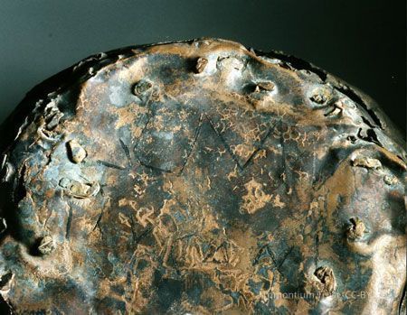 Bronze camp kettle with a Latin inscription reading 'The troops of Lucanus' punched twice on the bottom, from the Roman site of Newstead (Trimontium), late 1st or 2nd century ADUse