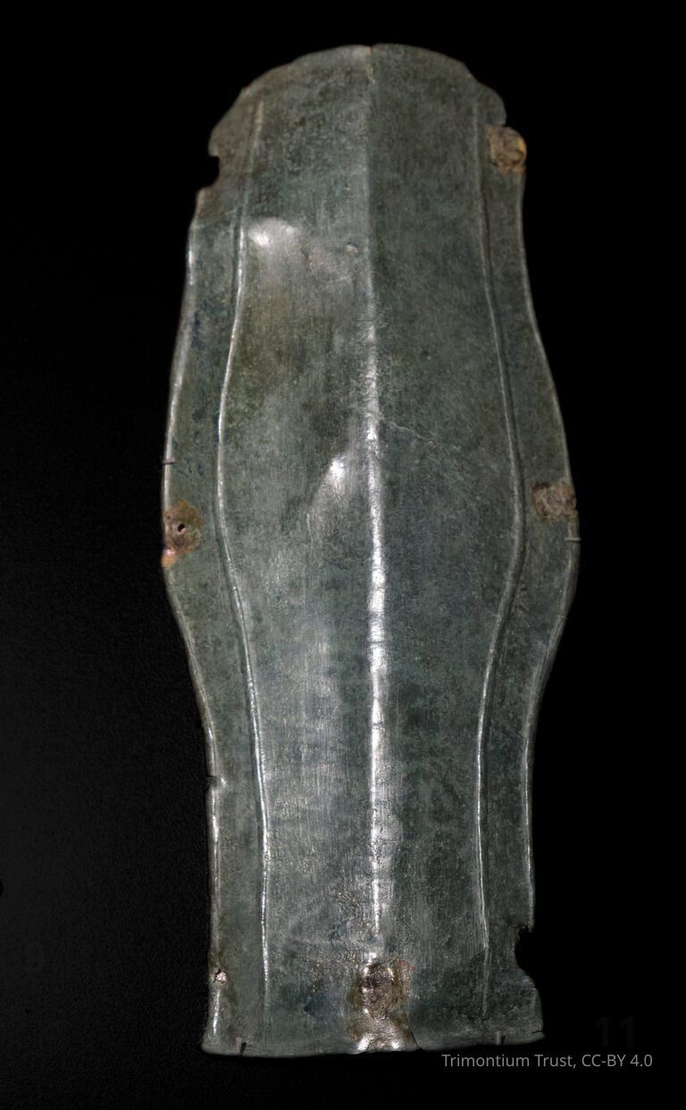 The legionary infantryman would be protected by a large rectangular shield, curved to protect his body, and wore various pieces of armour. Most important was the body armour which protected his torso and shoulders. It was made up of multiple iron plates fixed to leather straps, with brass buckles and hinges. This was highly flexible and offered excellent protection. Some infantrymen also wore a flexible arm guard, similarly made of metal strips of iron or brass, and metal greaves to protect their shins.