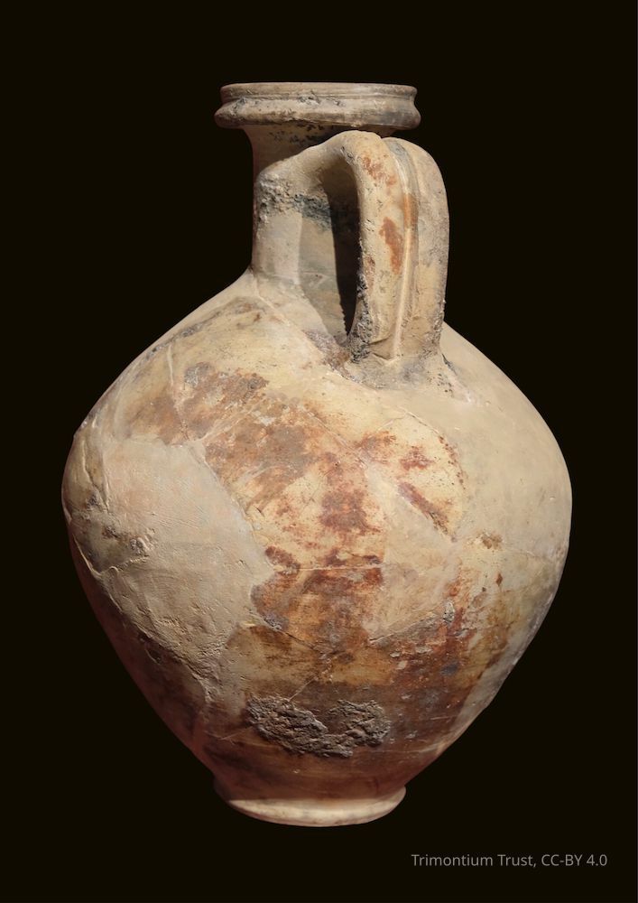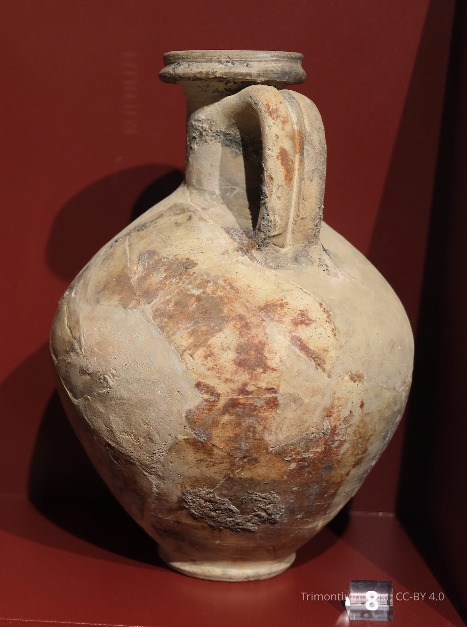 Coarse ware flagon. In several parts reconstructed with possible modern restorations.