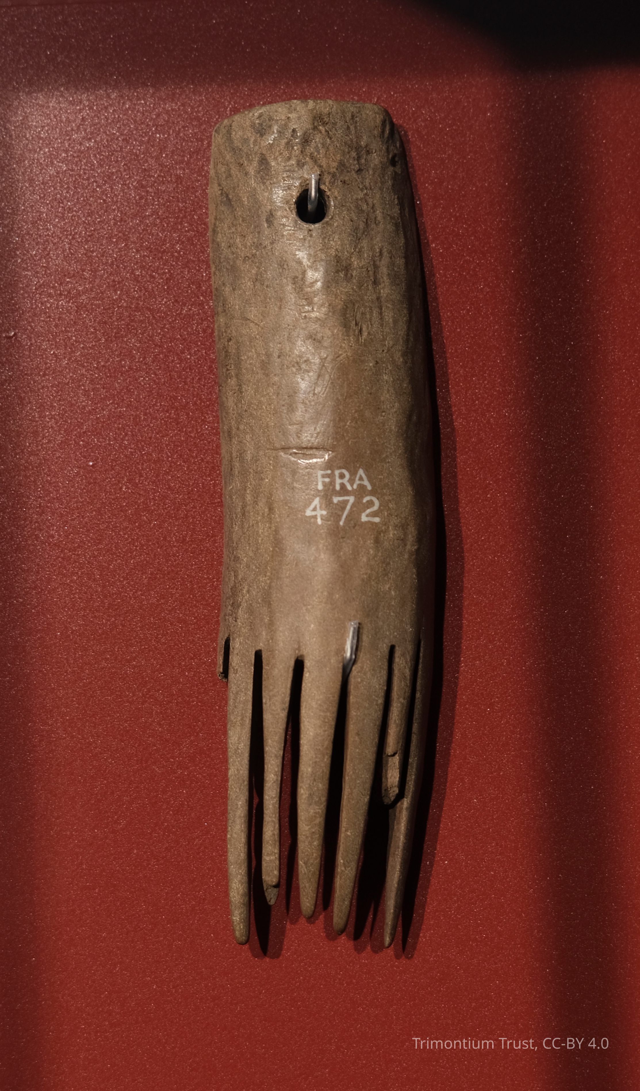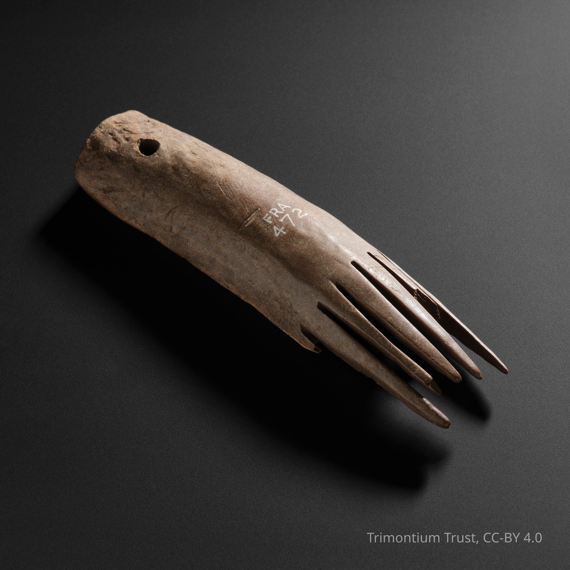 The round spindle whorl weighted the bottom of a spindle as it was spun, gradually twisting wool fibres into yarn. The combs may have been used for patting the yarn into place during weaving.