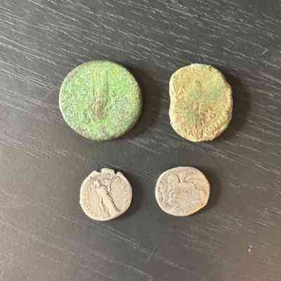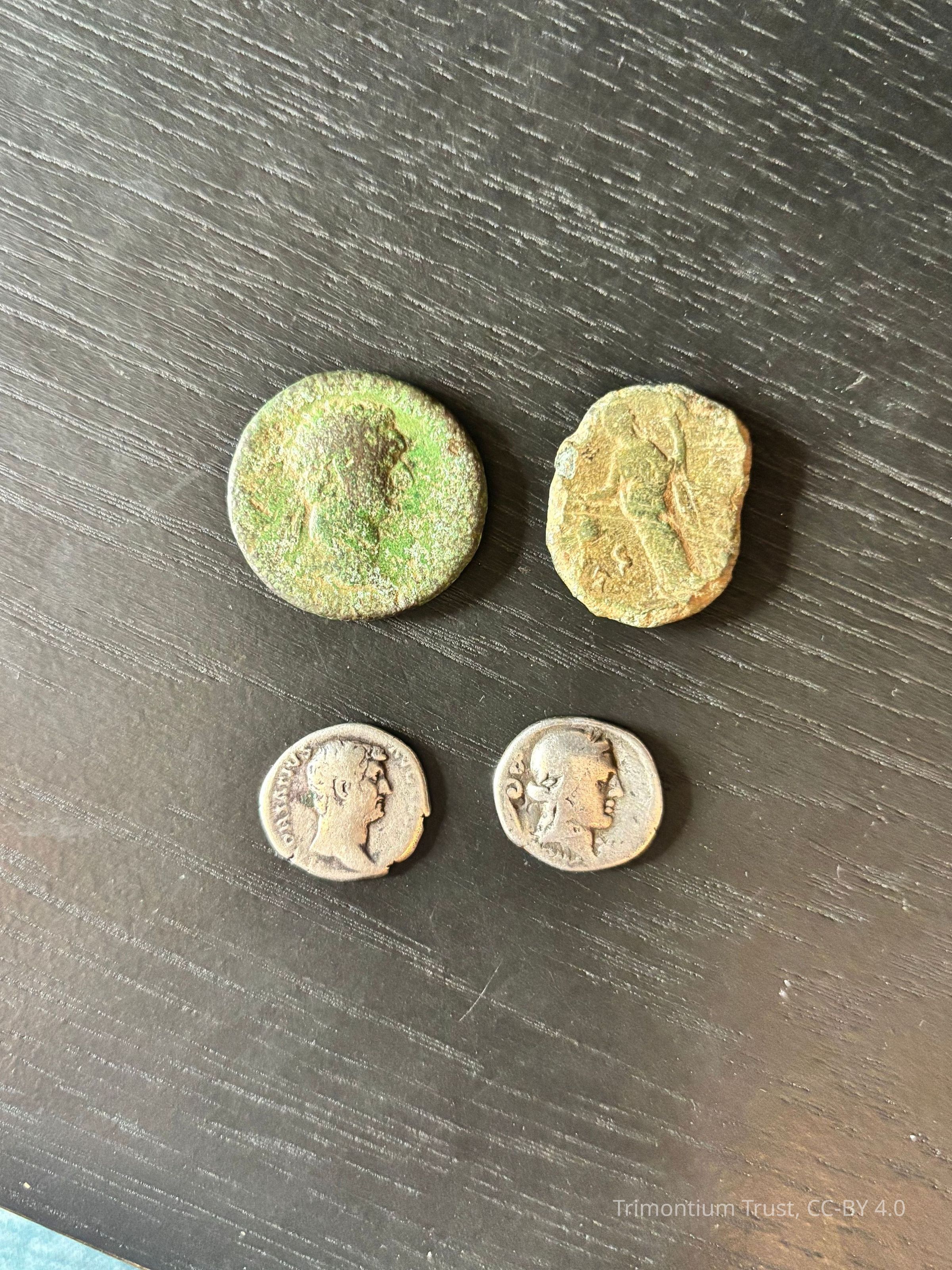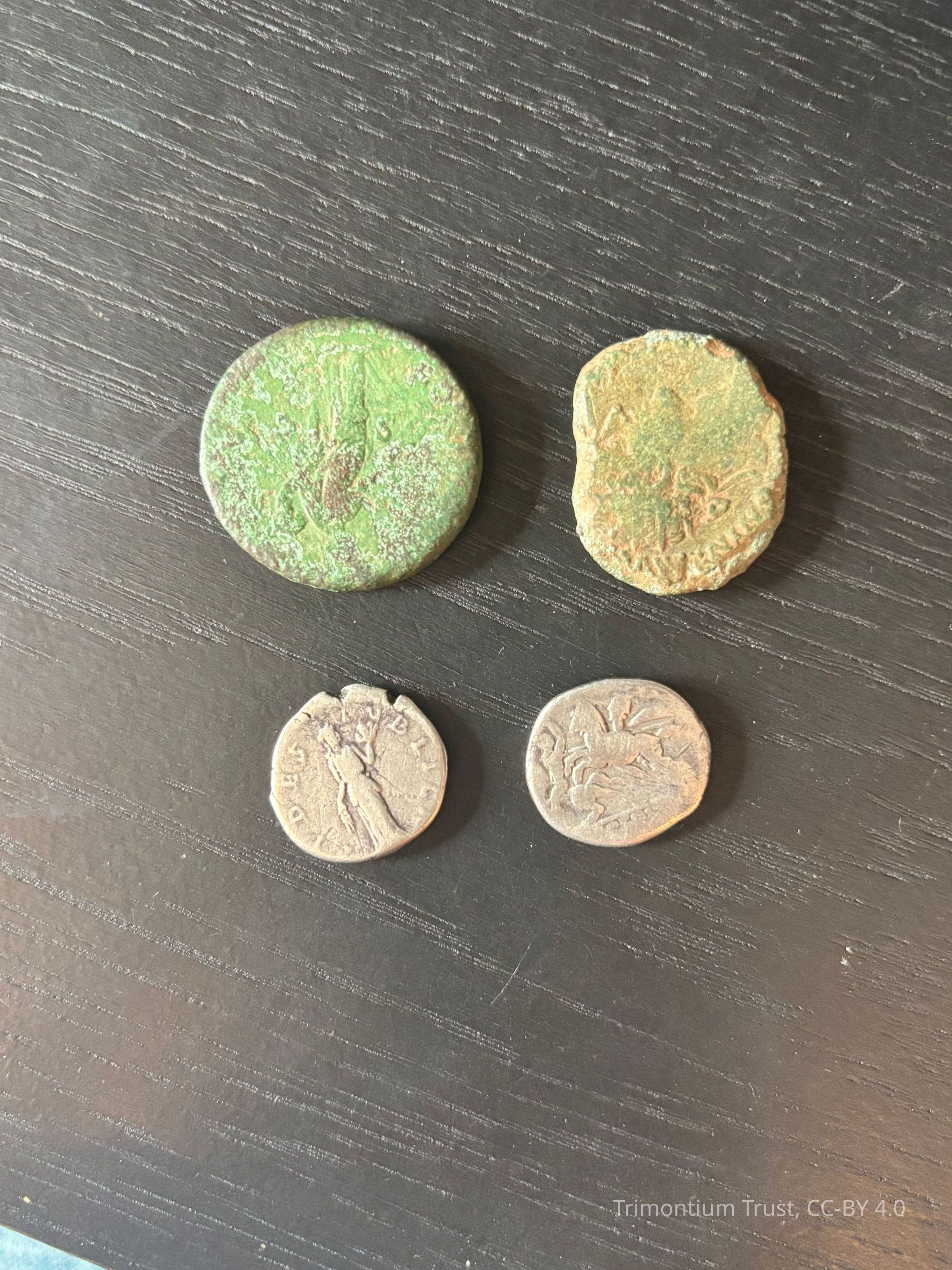 Mixed coins; two larger ones that are highly corroded and two smaller silver coins.