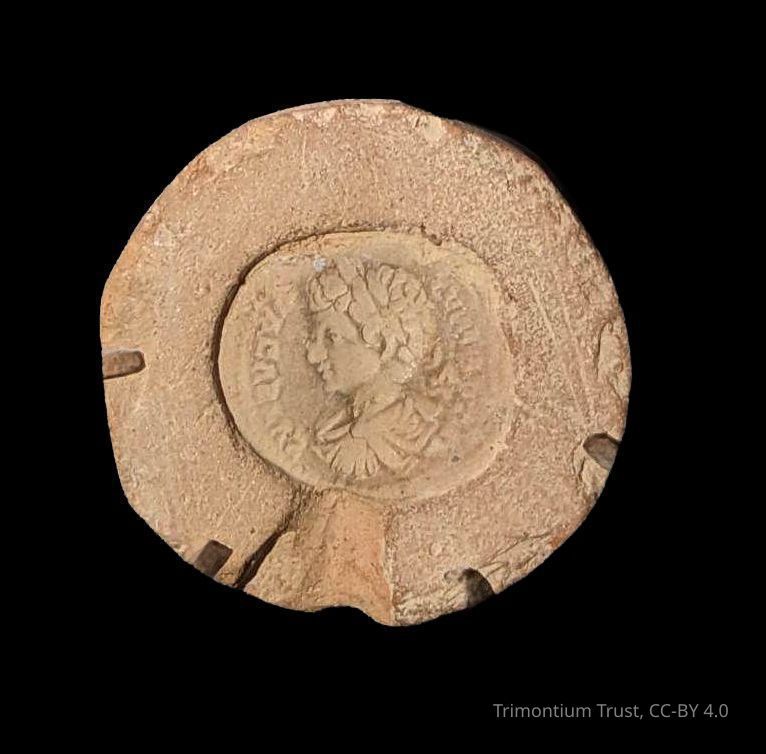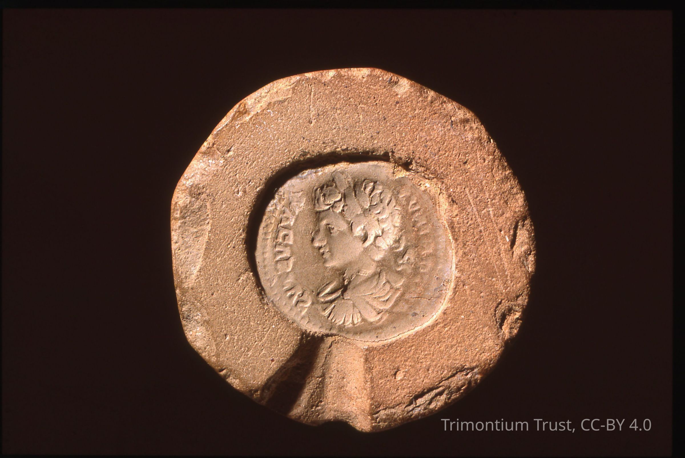 Counterfeit coin mould for a denarius c. AD199 on one side, reverse of a coin minted 70-75 years later on other side of Gallienus AD253-268. Found at Trimontium in 1940.Use