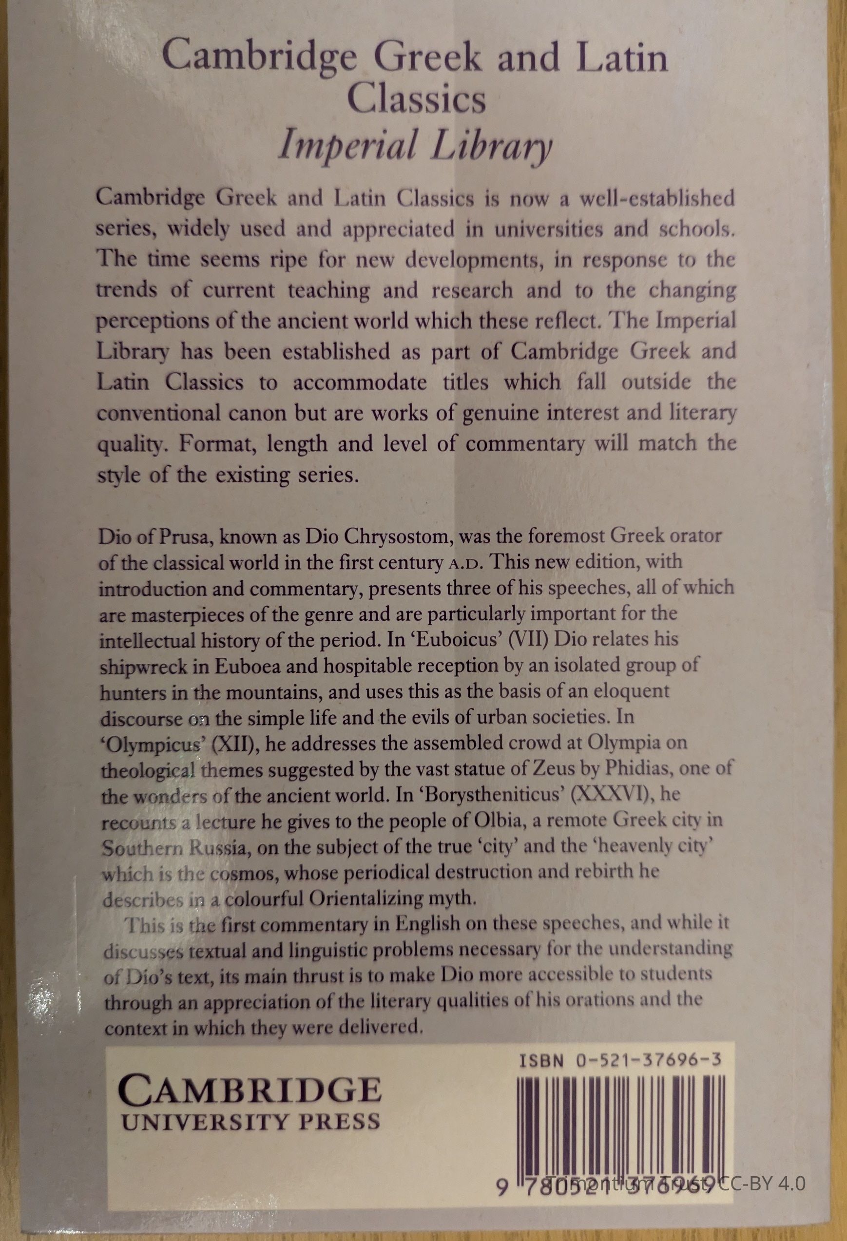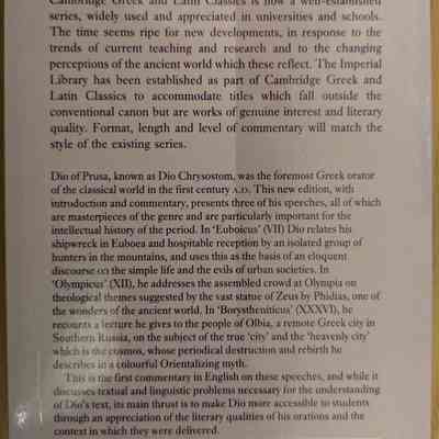 Dio of Prusa, known as Dio Chrysostom, was the foremost Greek orator of the classical world in the first century A.D. This new edition, with introduction and commentary, presents three of his speeches, all of which are masterpieces of the genre and are particularly important for the intellectual history of the period. In 'Euboicus' (VII) Dio relates his shipwreck in Euboea and hospitable reception by an isolated group of hunters in the mountains, and uses this as the basis of an eloquent discourse on the simple life and the evils of urban societies. In 'Olympicus' (XII), he addresses the assembled crowd at Olympia on theological themes suggested by the vast statue of Zeus by Phidias, one of the wonders of the ancient world. In 'Borystheniticus' (XXXVI), he recounts a lecture he gives to the people of Olbia, a remote Greek city in Southern Russia, on the subject of the true 'city' and the 'heavenly city' which is the cosmos, whose periodical destruction and rebirth he describes in a colourful Orientalizing myth.Context